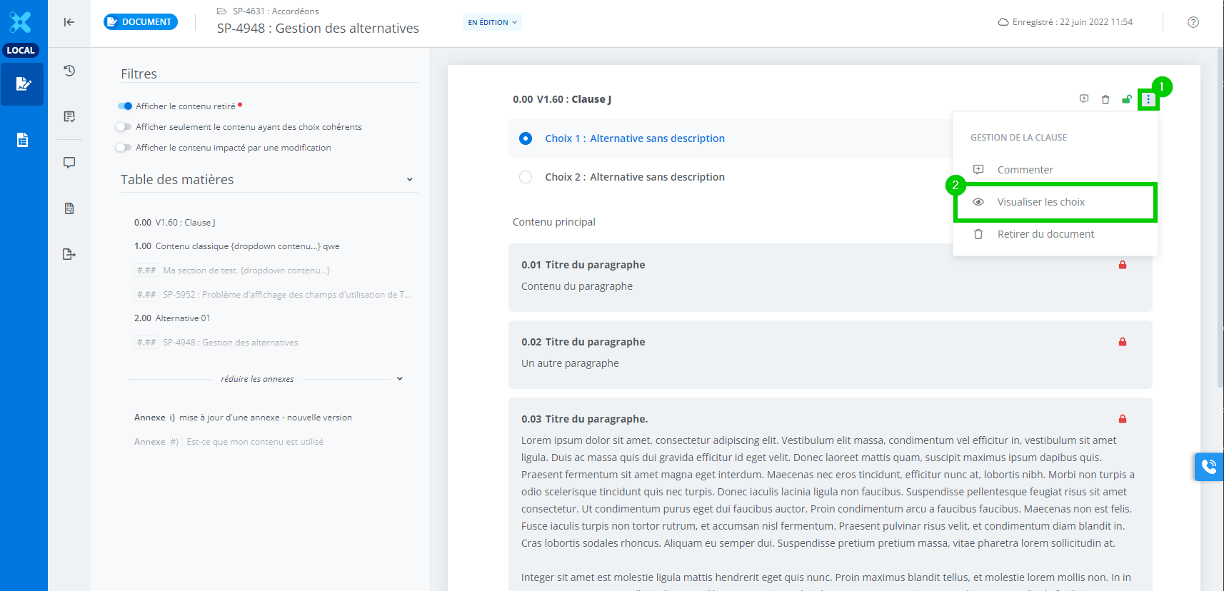Pour l’exemple ci-dessus, l’alternative Choix 1 n’est plus active / sélectionnée dans le document, à sa place l’alternative Choix 2 l’est.