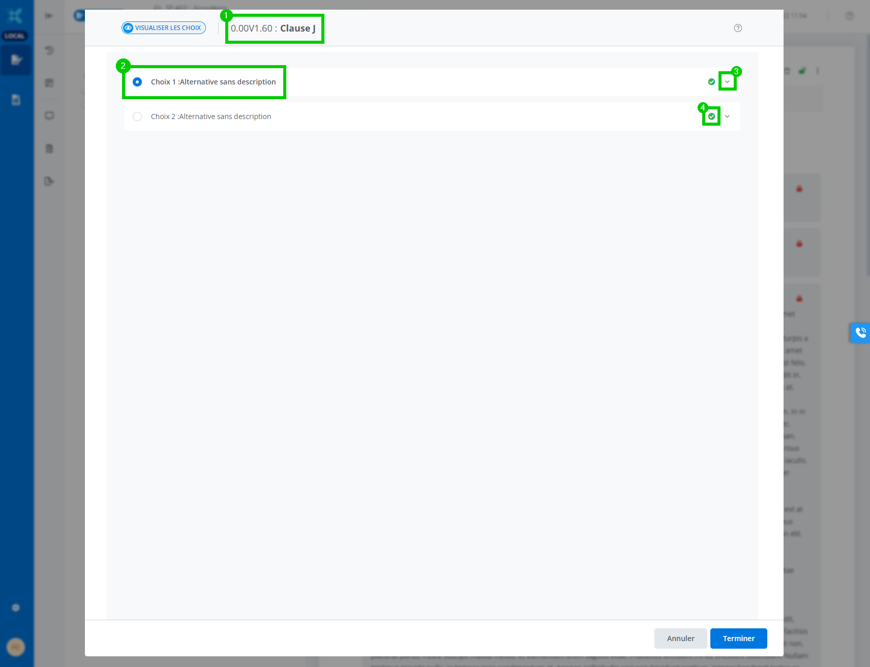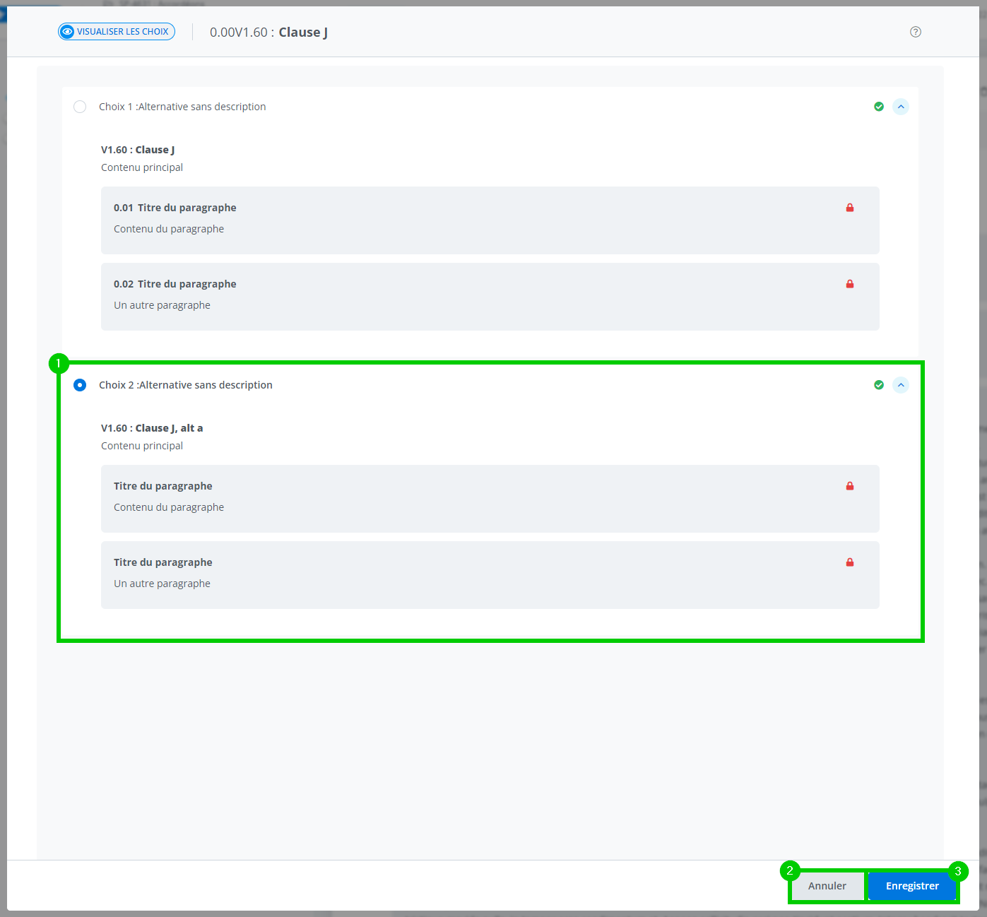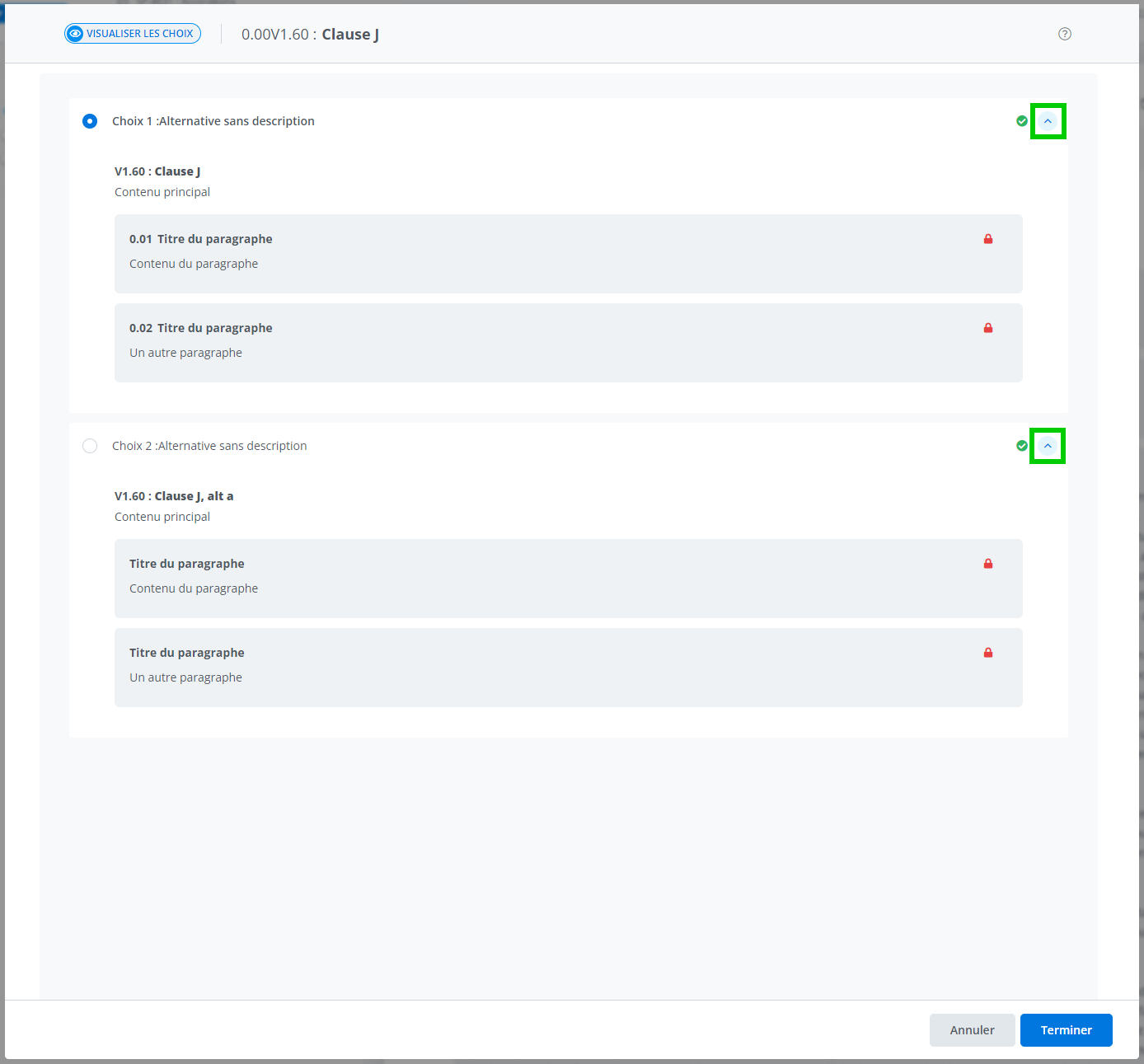 Permet de consulter ou de choisir entre différentes alternatives dans un document. La vue des accordéons offre plus de détails et une meilleure lisibilité du contenu; aussi, il est plus facile de comparer deux alternatives, car on peut réduire ou développer le tiroir contenant la clause ou l'annexe.