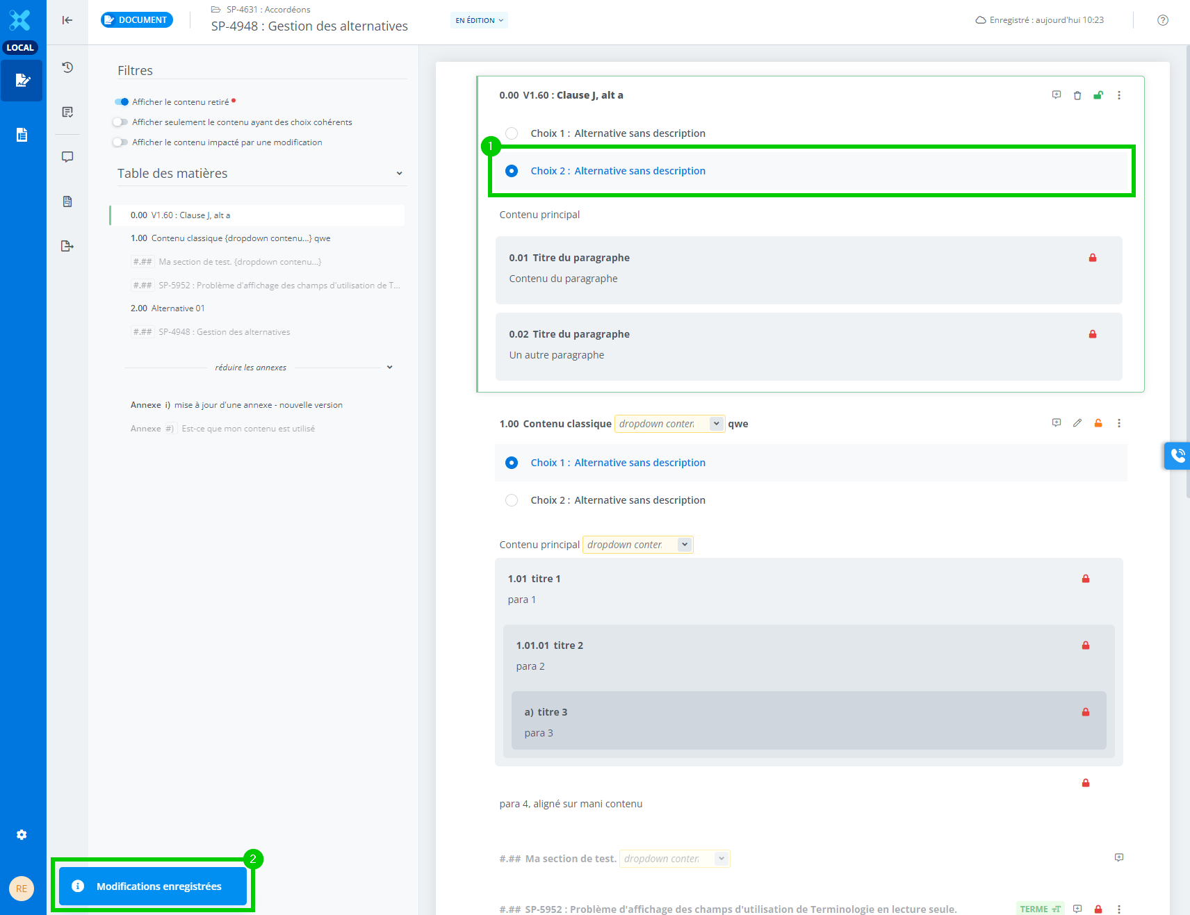 Accordéons - Gestion des alternatives dans le document