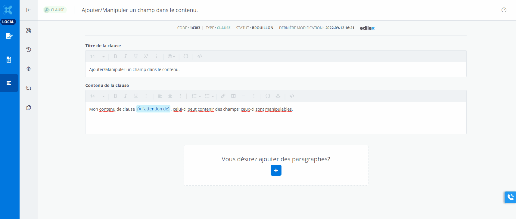 Permet d’ajouter des champs déterminés* ou libres* dans un contenu; une fois ajoutés, ces champs peuvent être sujets aux manipulations suivantes :