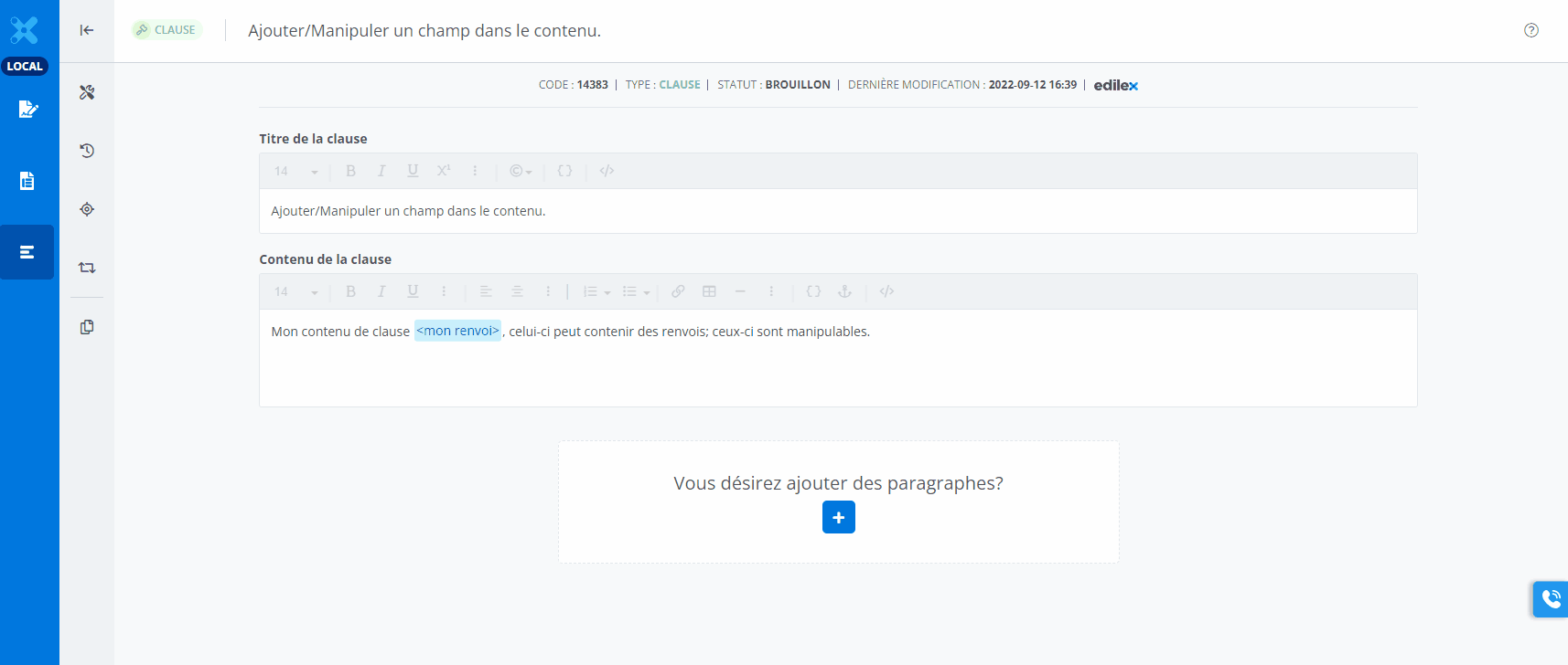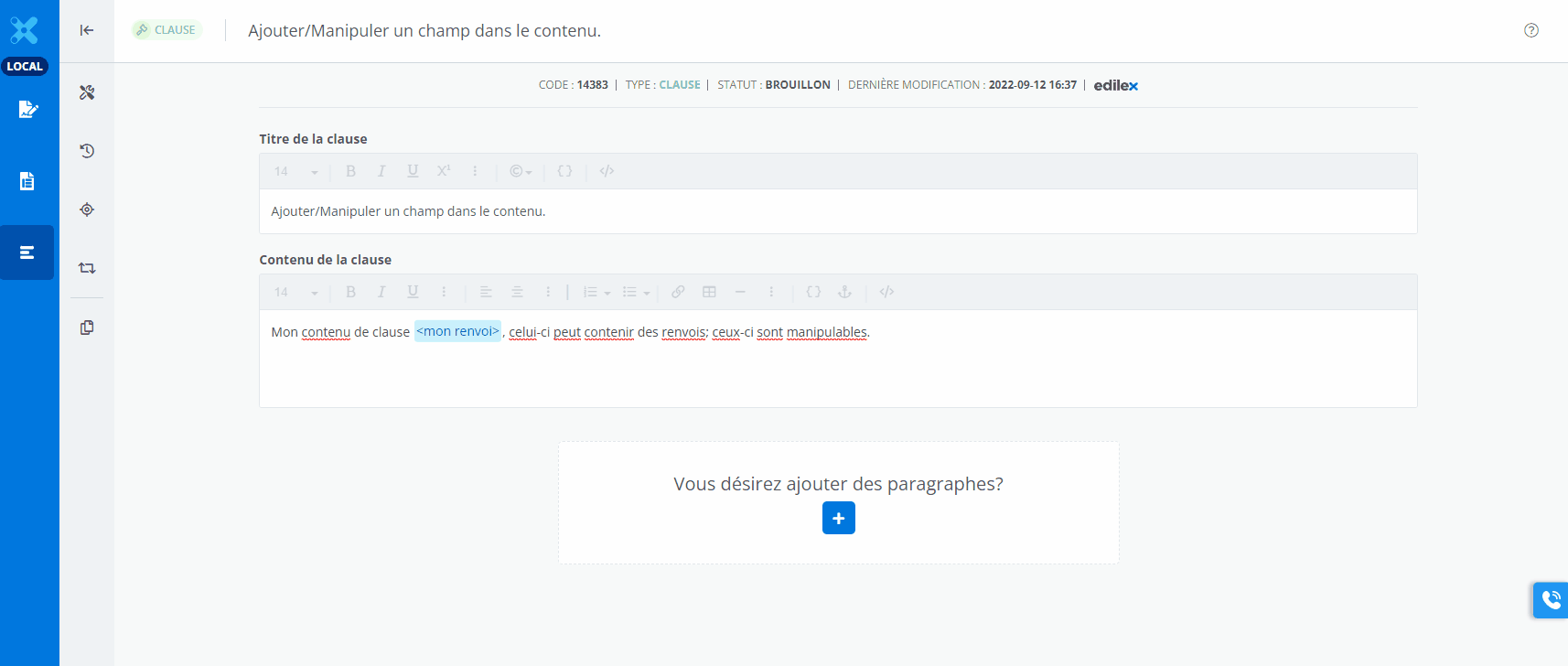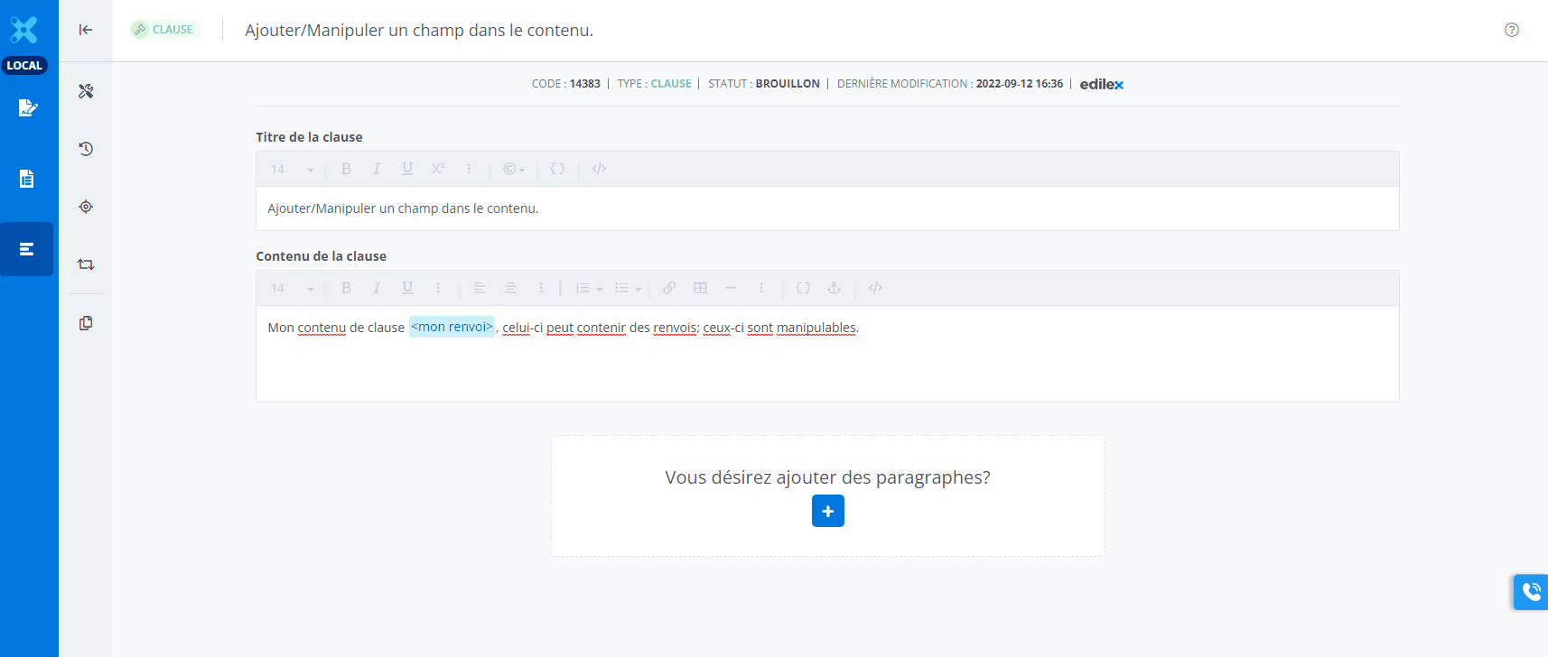 Contrairement aux champs, le renvoi n’ouvre pas une nouvelle fenêtre modale; il est créée directement dans le contenu.