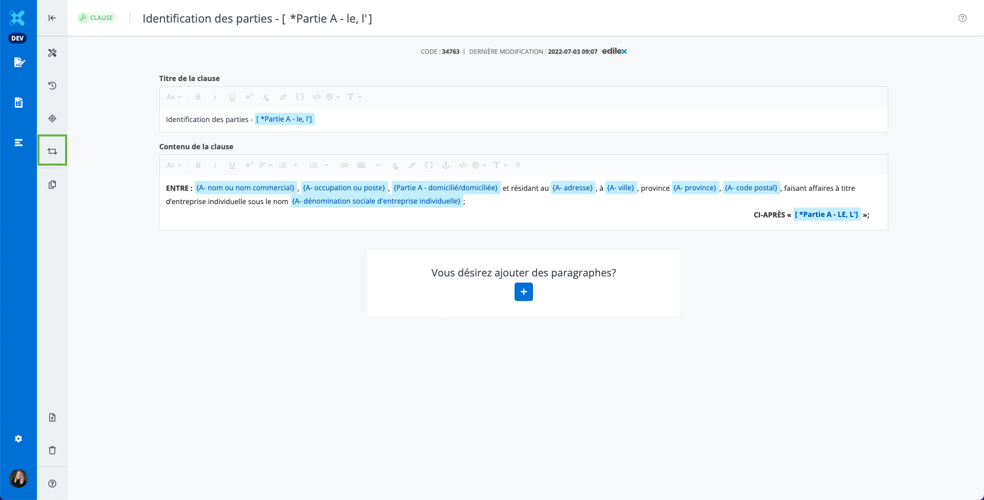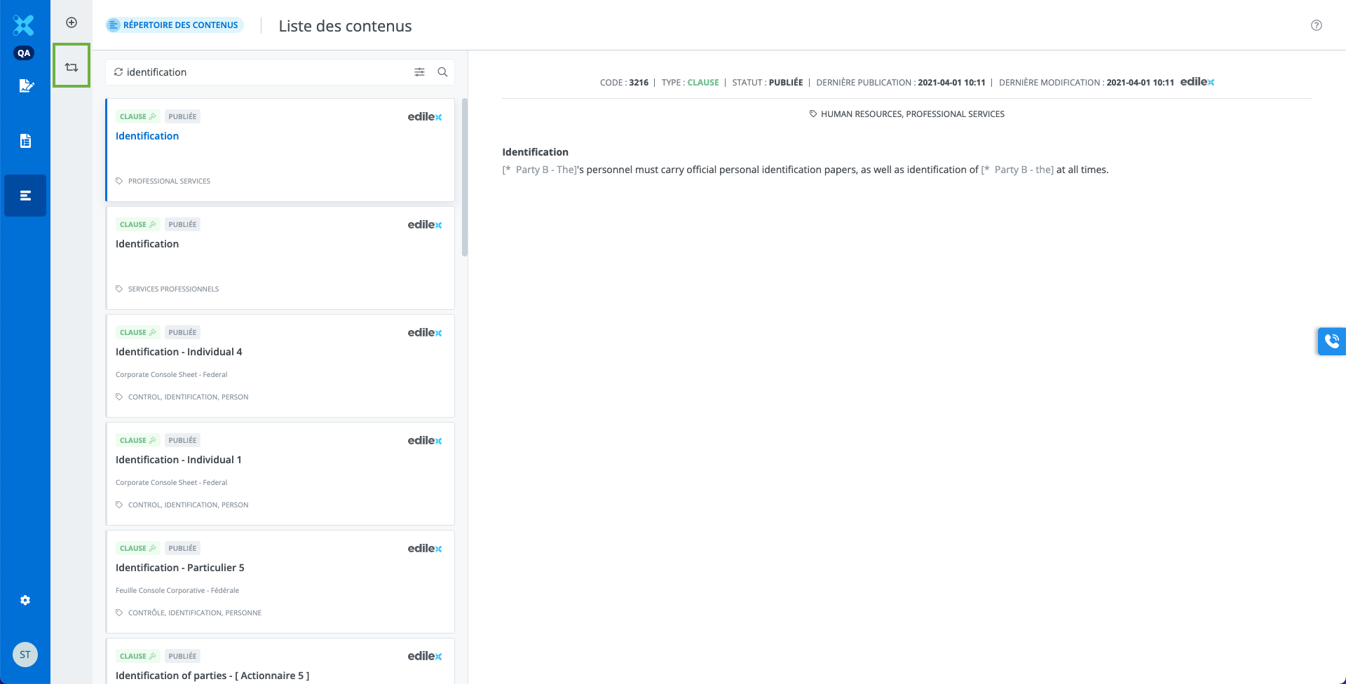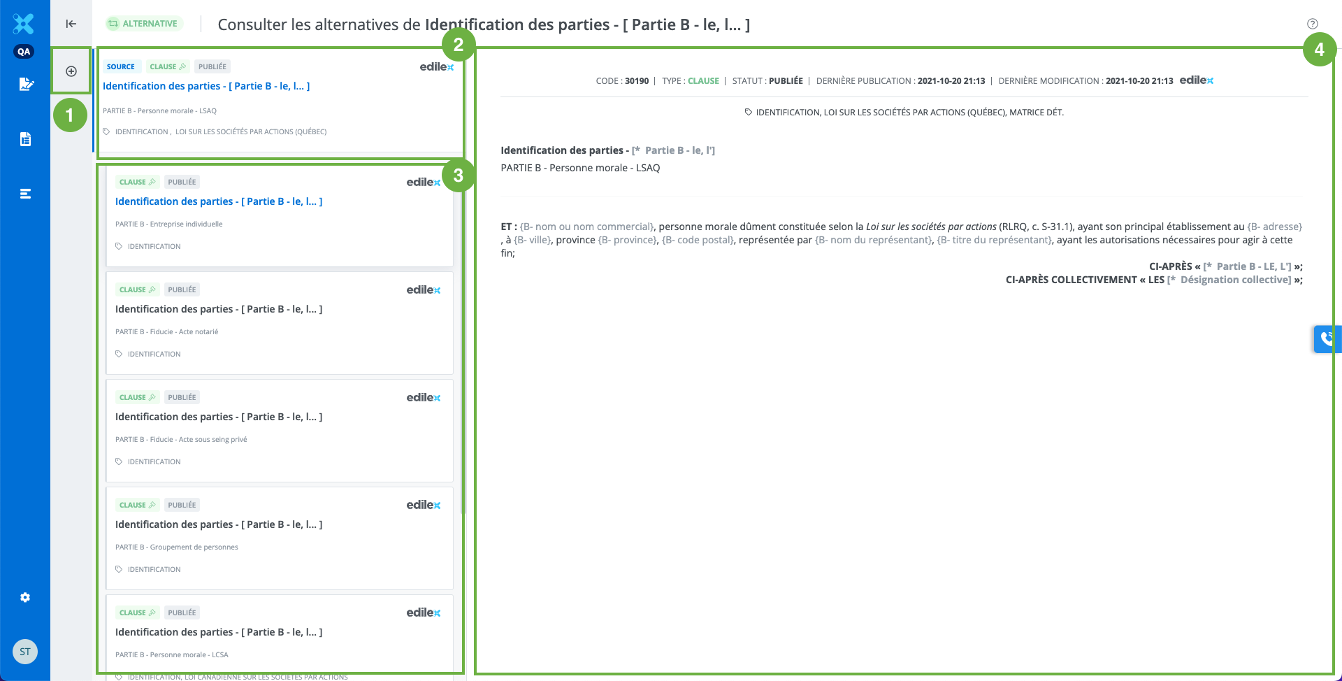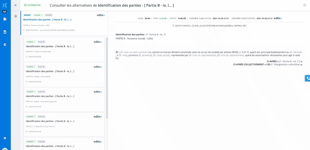 La fenêtre de visualisation de la clause. Il est possible de lire le contenu des différentes alternatives en cliquant sur les tuiles.