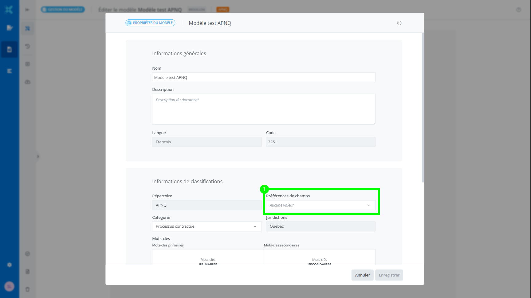 À noter que tant que le modèle est en brouillon, il est possible de modifier la préférence associée à celui-ci et même de n’y associer aucune préférence de champs en sélectionnant l’option « aucune valeur ».