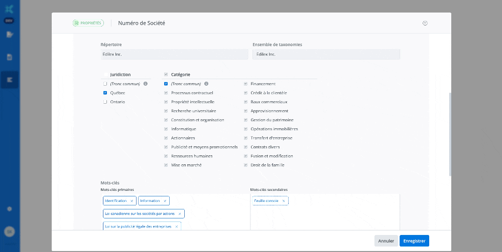 Les propriétés permettent d’assigner des mots-clés à une clause et de lui ajouter une description. Les mots-clés et la description sont utiles lors de la recherche de la clause, car ils en facilitent le repérage.