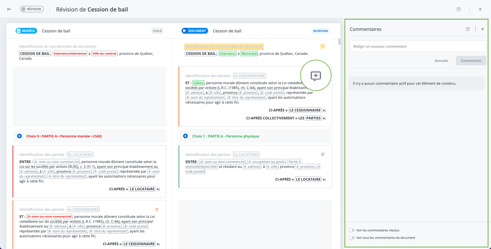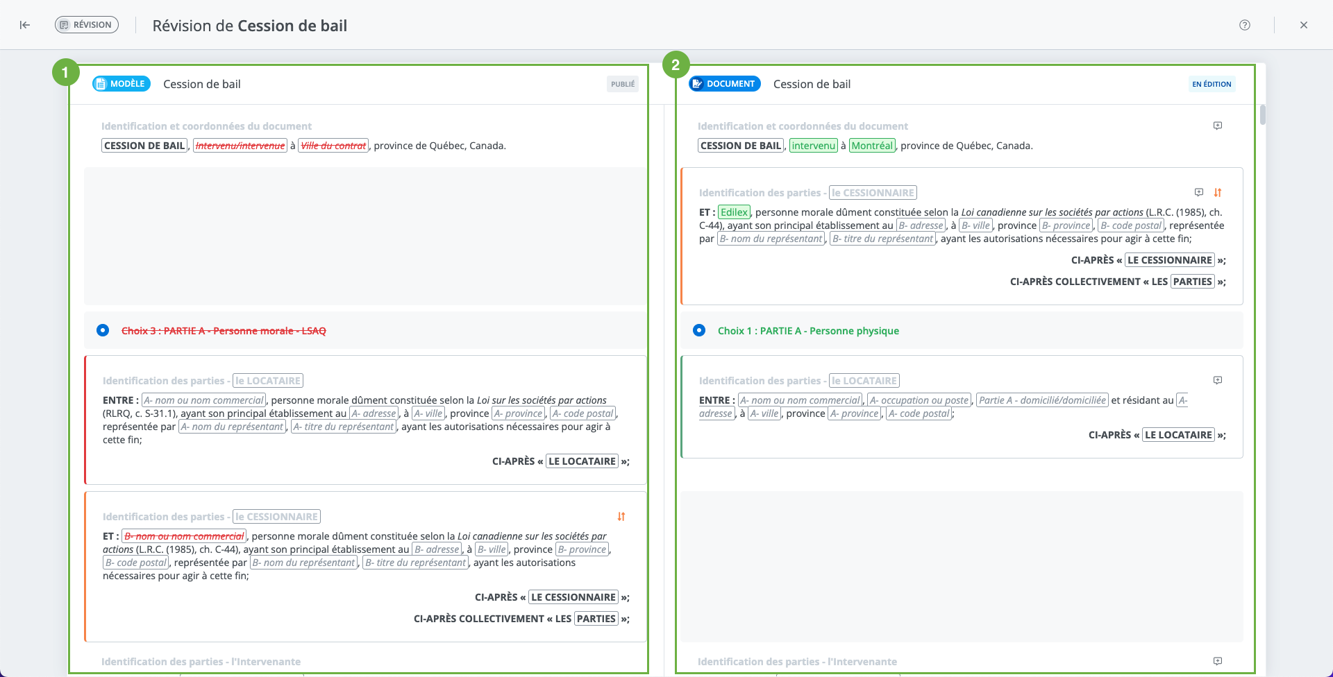 L’outil de révision permet de comparer le document avec le modèle original. Vous pouvez donc y voir tous les changements qui ont été apportés au document par vous ainsi que par tous les collaborateurs.