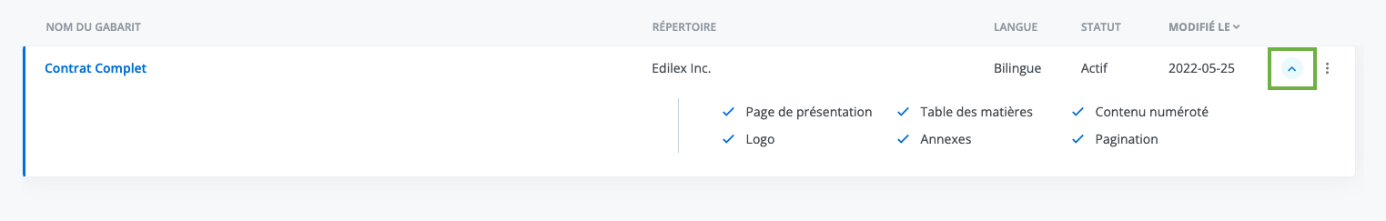 Il est possible de consulter les caractéristiques du gabarit en cliquant sur le bouton avec une flèche.