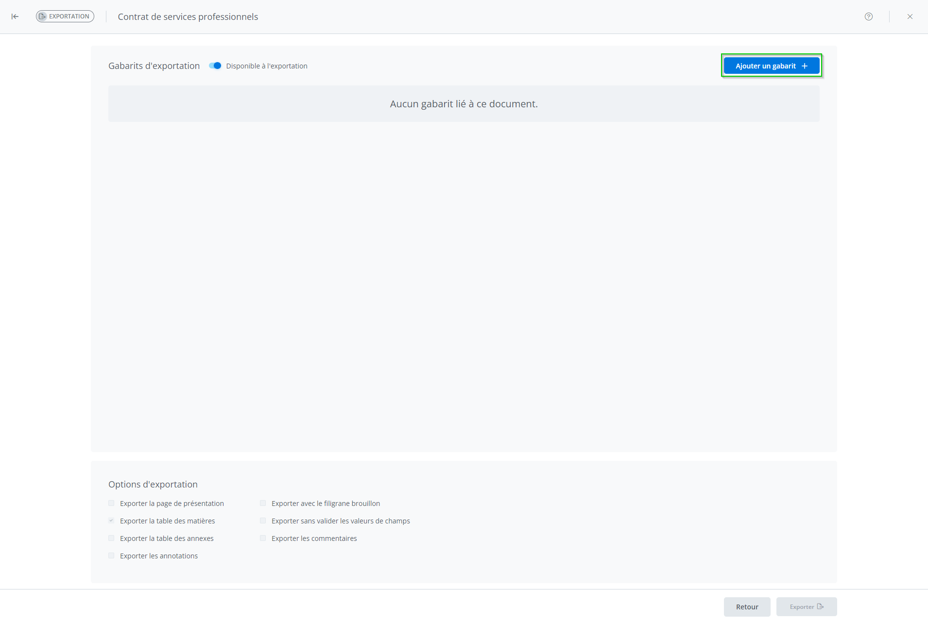 Les options d’exportation présélectionnées sont celles qui ont été sélectionnées lors de la dernière exportation (à la condition qu’elles soient valides pour le gabarit choisi).
