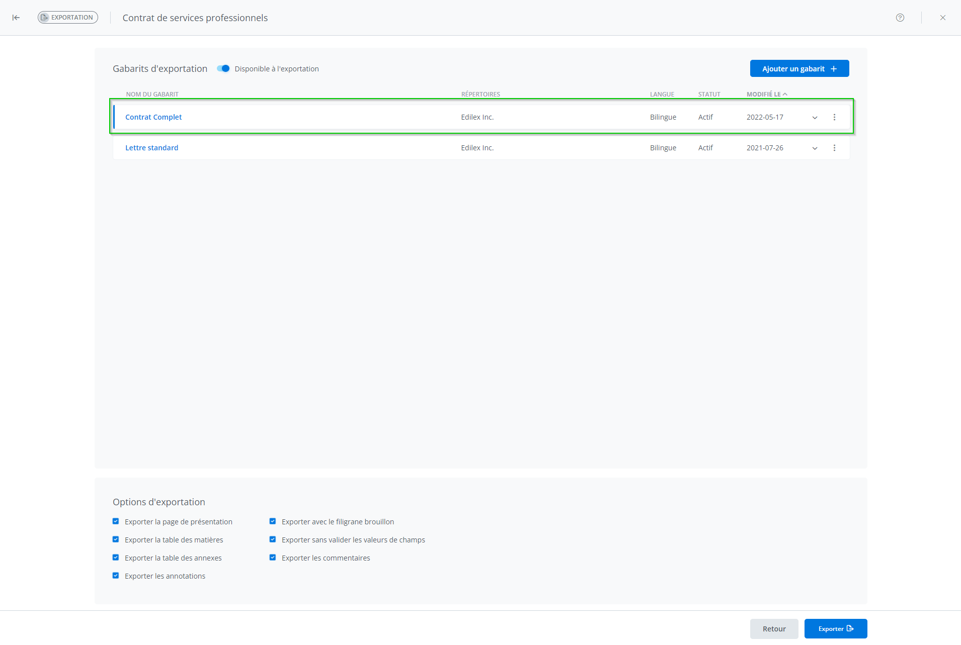 Edilex offre plusieurs gabarits d’exportation pour vos documents. Le style et la mise en page des gabarits diffèrent selon chaque gabarit et selon le type de document généré.