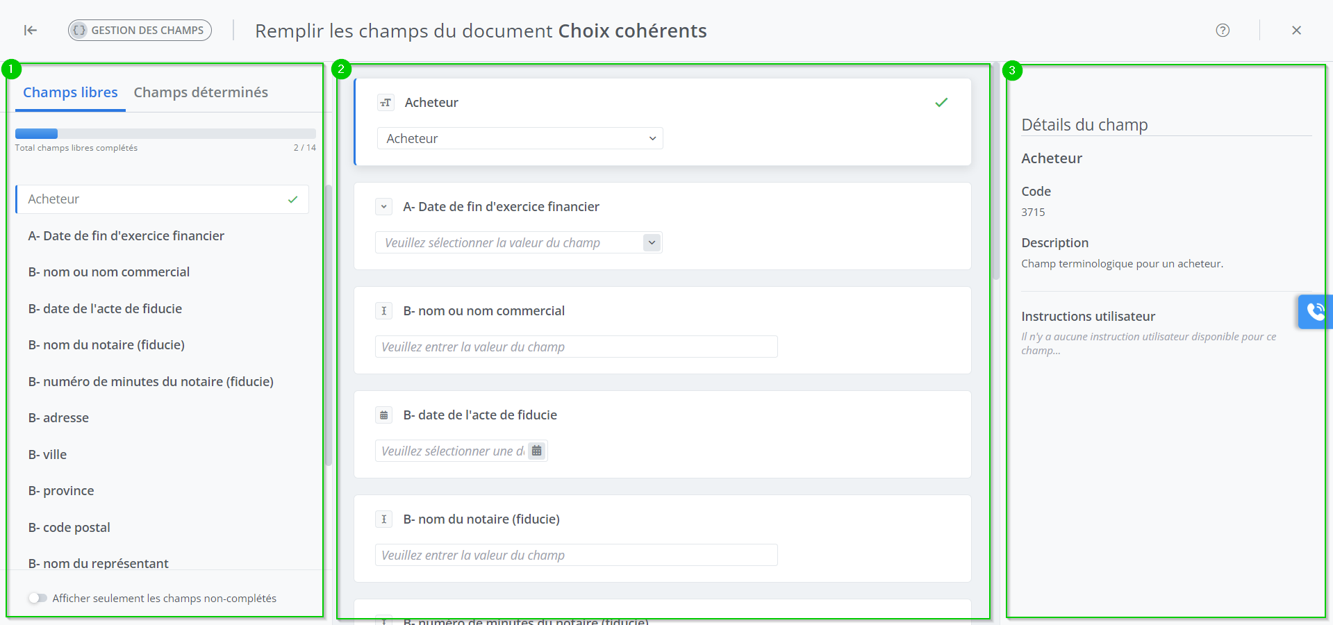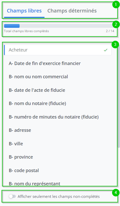Informe du nombre total de champs complétés pour l’onglet sélectionné.La liste de champs;