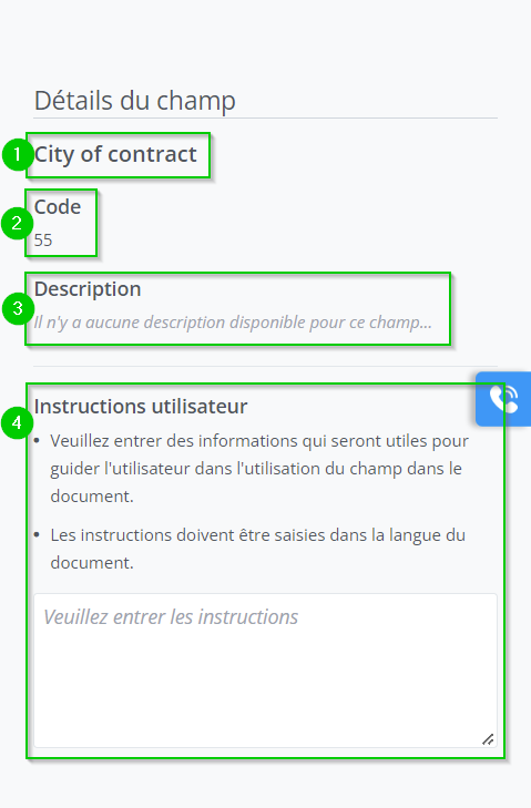 Lorsqu’on accède au formulaire de champs depuis un document de contrat, le champ Instructions utilisateurs du panneau de détails est en lecture seule.