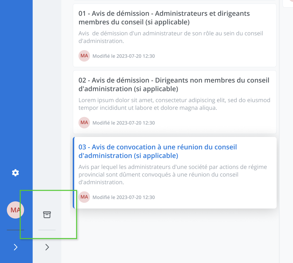 Afin d’archiver un projet, cliquez sur le bouton Archiver dans le menu des fonctionnalités. Ensuite, confirmez l’archivage du projet dans le message de confirmation en cliquant sur le bouton Archiver.