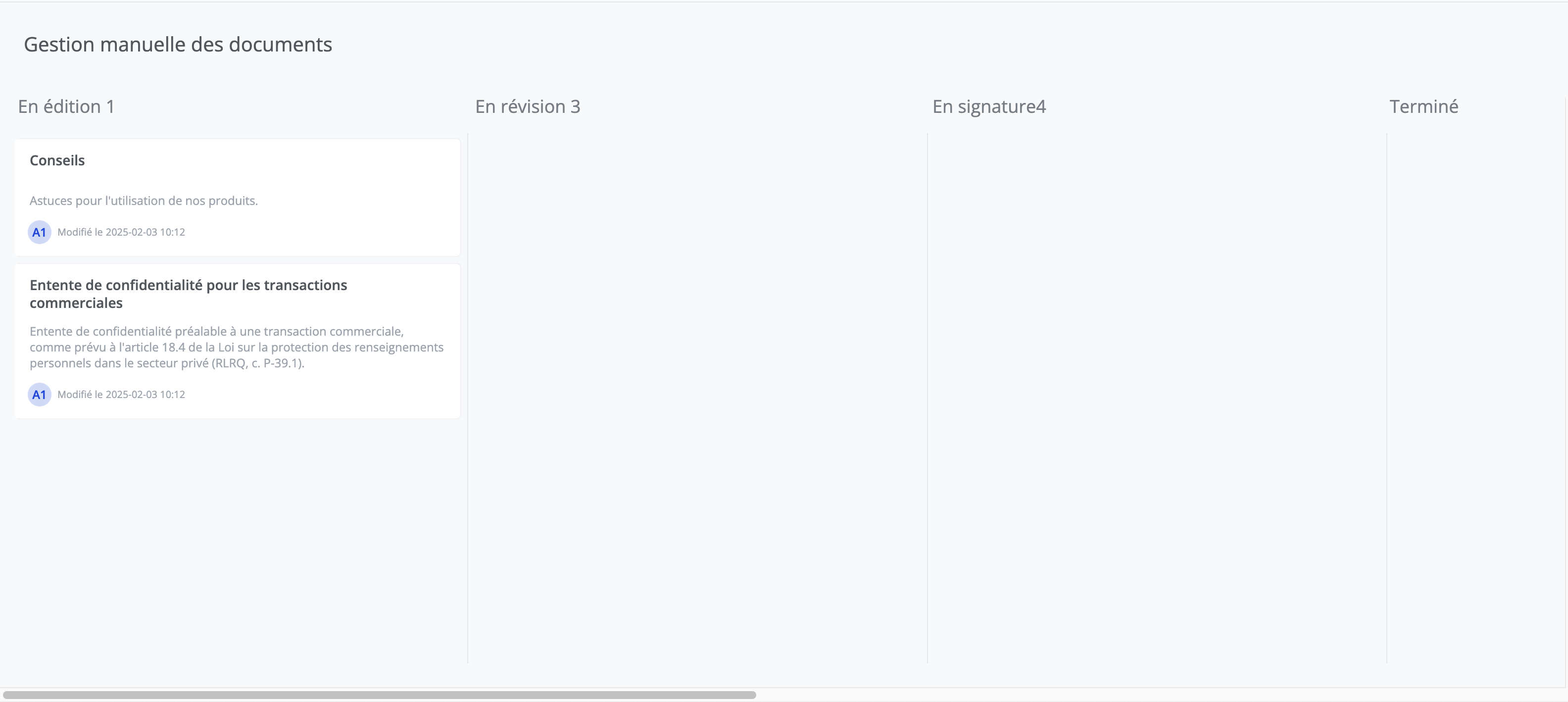 La section de gestion manuelle des documents vous permet de suivre l’avancement de la rédaction de vos documents à l'étape Brouillon du projet. Selon le nombre de colonnes qui a été configuré, vous pourrez naviguer horizontalement dans cette section afin de consulter vos documents.