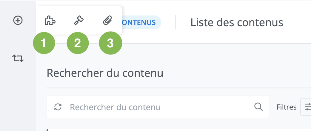 2. Sélectionner l’icône représentant le contenu à créer (voir légende ci-dessus) : une section (1), une clause (2), une annexe (3);