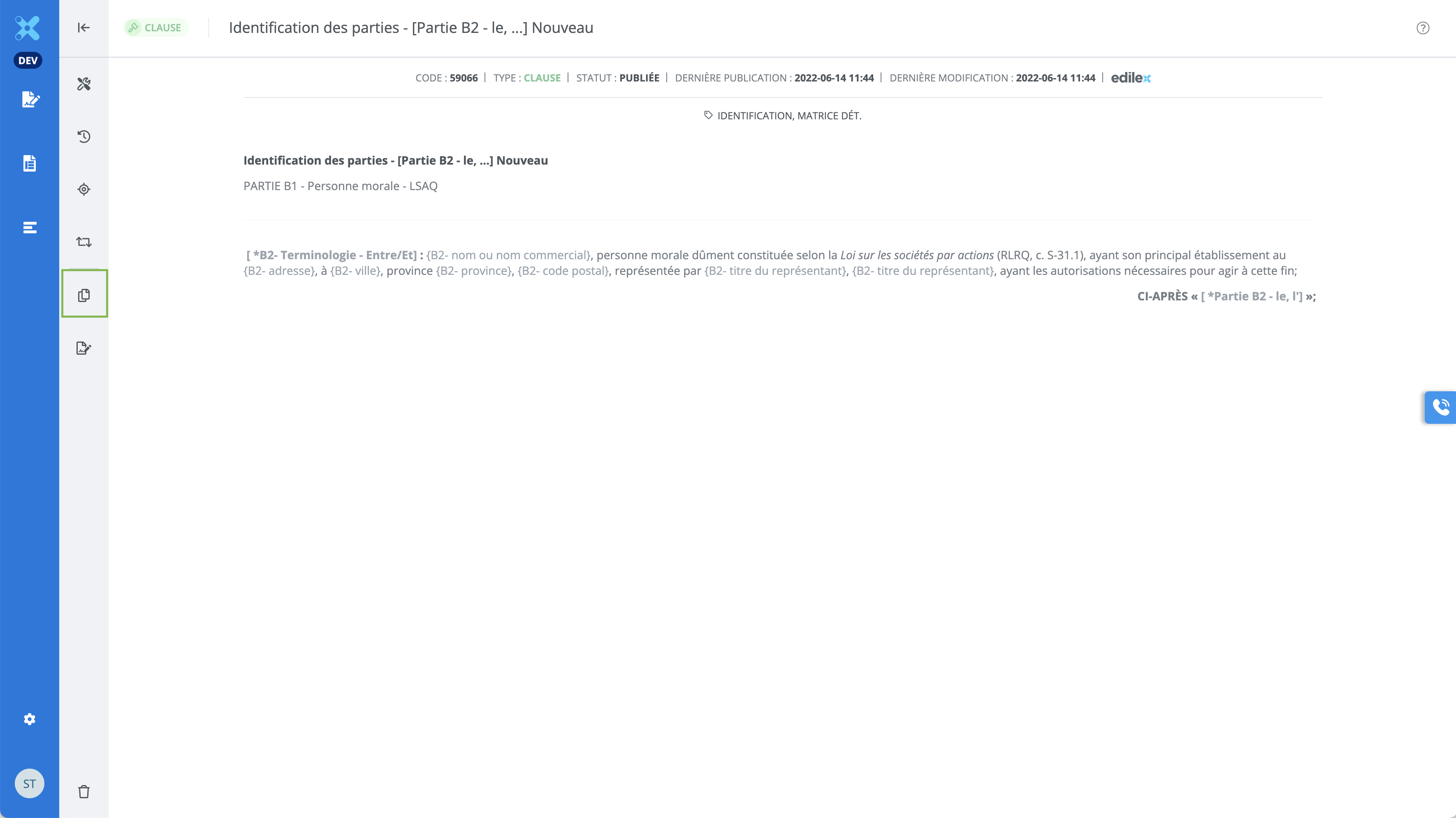 Permet de copier une clause, incluant ses propriétés (mots-clés et description). Les clauses en brouillon et les clauses publiées peuvent être dupliquées.