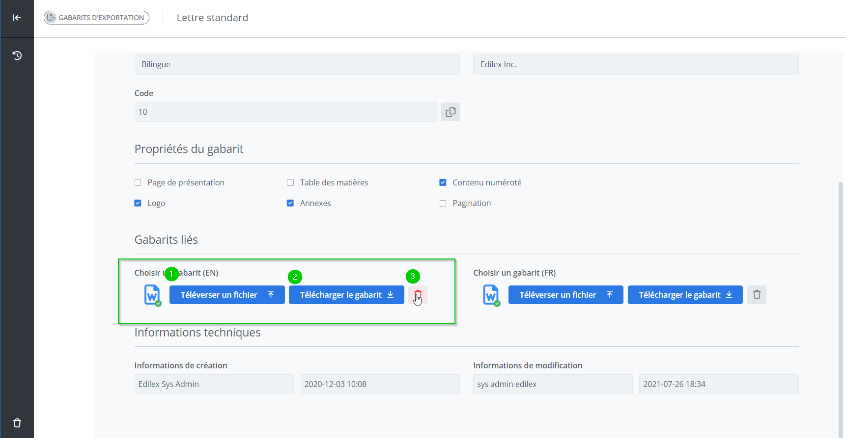 Il est possible de supprimer un fichier de modèle de gabarit associé à un gabarit en tout temps en appuyant sur l’icône de poubelle. Aucune validation n’est effectuée pour supprimer un fichier.