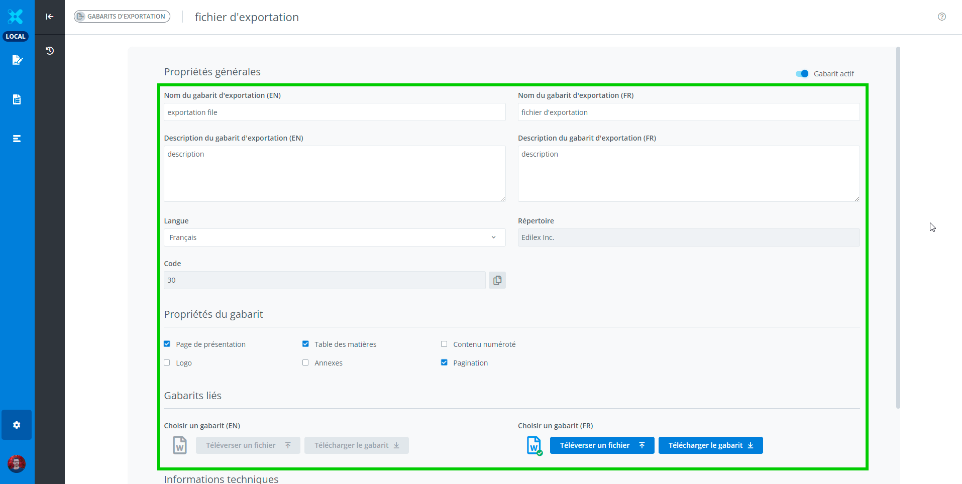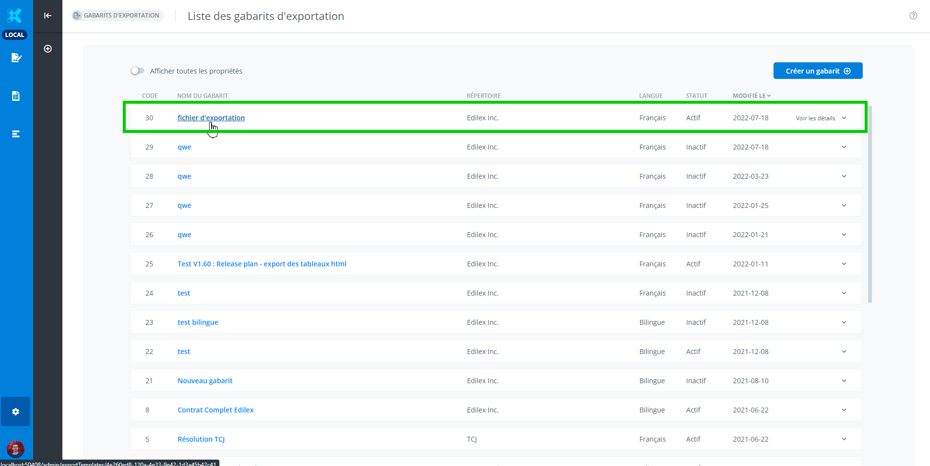 Il est possible d'éditer un gabarit d’exportation à partir de la liste des gabarits d’exportation.