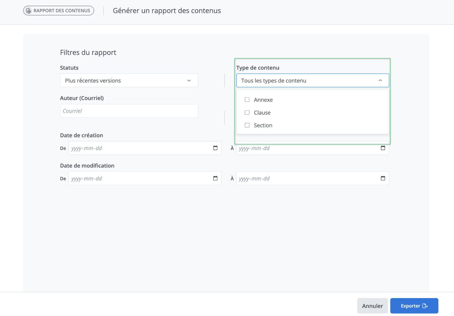 Vous pouvez ensuite sélectionner pour quels type de contenu vous souhaitez obtenir un rapport, Tous les types de contenu, seulement pour les Annexes, seulement pour les Clauses ou seulement pour les Sections.