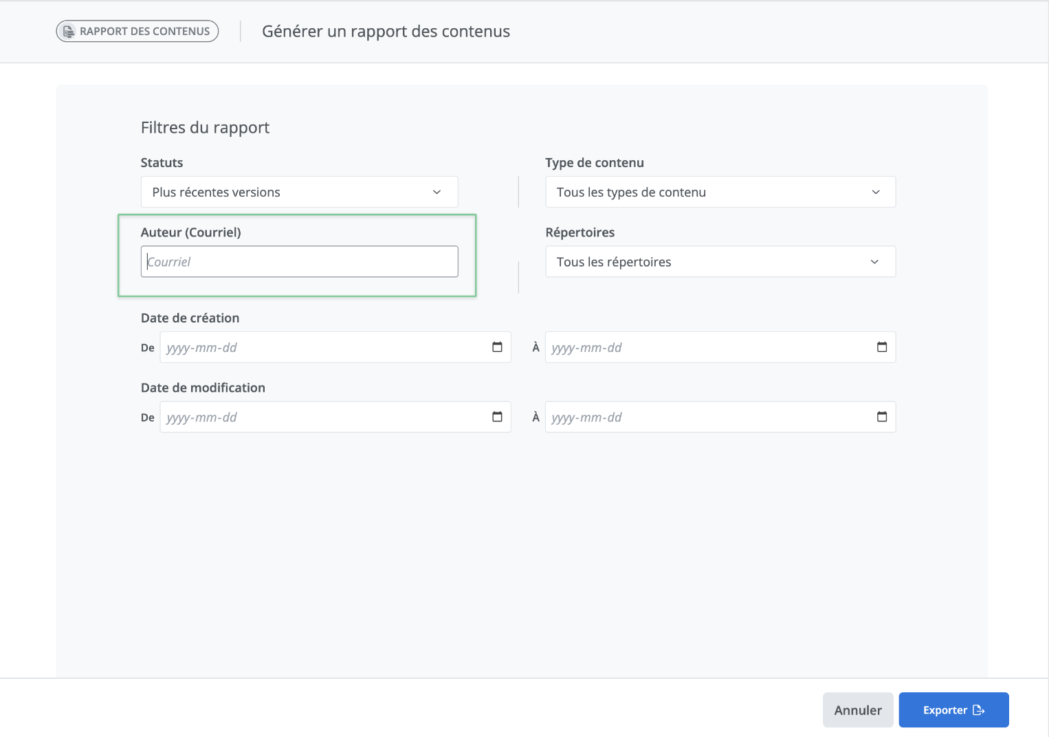 Vous pouvez également obtenir des informations de contenus pour un utilisateur en particulier. Pour ce faire, vous pouvez renseigner le champ filtre Auteur (courriel) destinés à cet effet. Il ne suffit que d'entrer le courriel de l’utilisateur pour lequel vous souhaitez obtenir les informations de contenu.