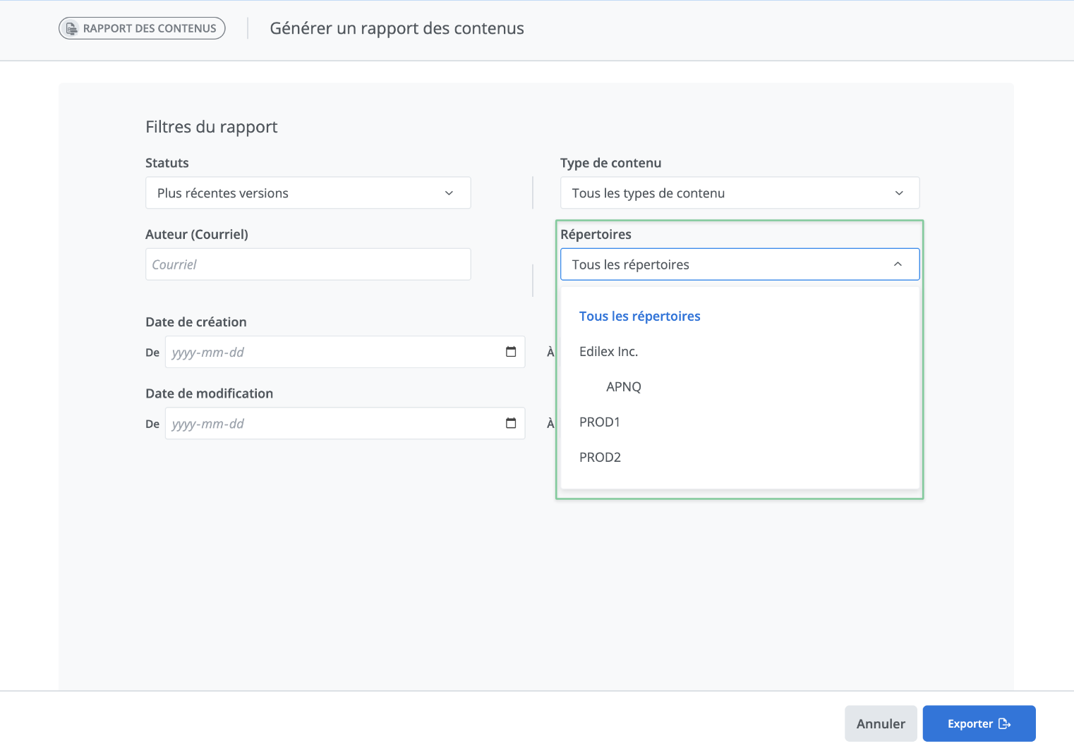 Vous pouvez aussi obtenir des informations de contenus pour un répertoire spéficique. Pour ce faire, il ne suffit qu'à sélectionner le nom du répertoire qui vous intéresse en accédant à la liste du menu déroulant Répertoire. Il vous sera alors possible de filtrer par Tous les répertoires ou encore d’en choisir un seul à travers ceux auxquels vous avez accès.