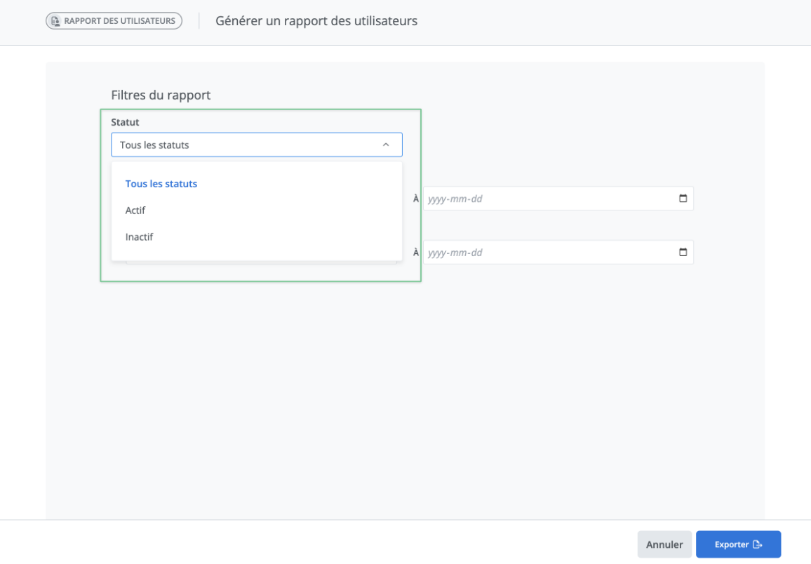 Commencez par sélectionner l’option de statut d’utilisateur, Tous les statuts, seulement les utilisateurs actifs ou seulement les utilisateurs inactifs.