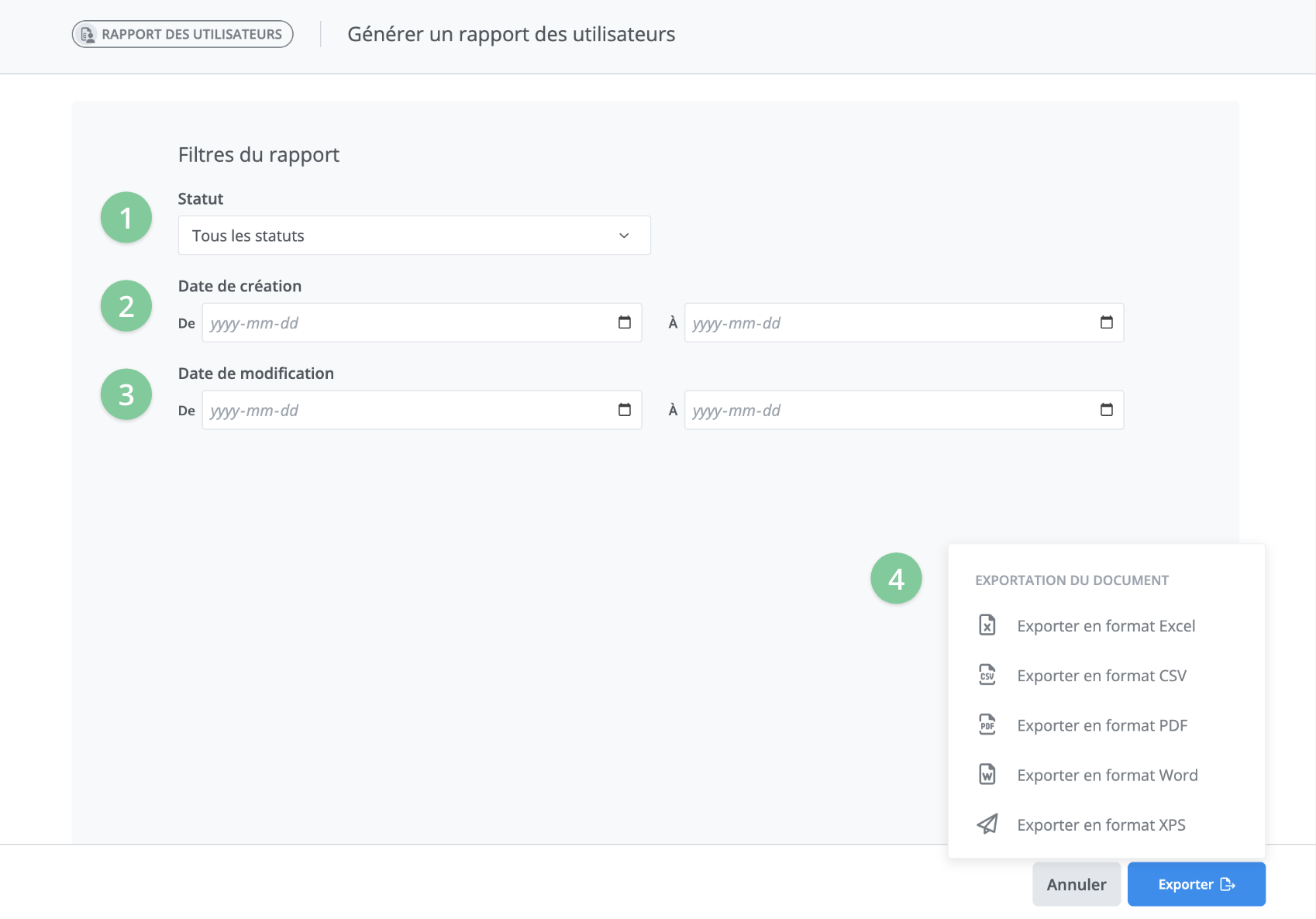 Cliquez finalement sur le bouton “Exporter”. Vous pourrez alors choisir en quel format votre rapport d’utilisateurs sera exporté.
