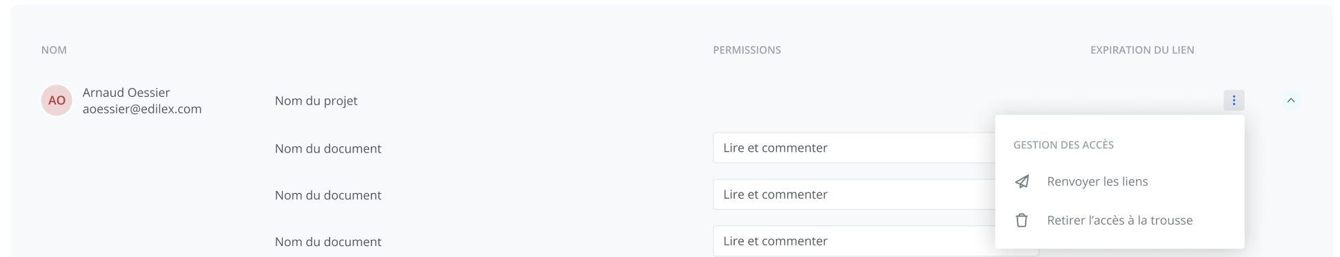 Retirer l’accès à trousse: vous permet de retirer en un seul clic l’accès à tous les documents de votre projet auxquels l’invité a accès. Vous pourrez à tout moment repartager les accès avec ce même utilisateur si vous le souhaitez.
