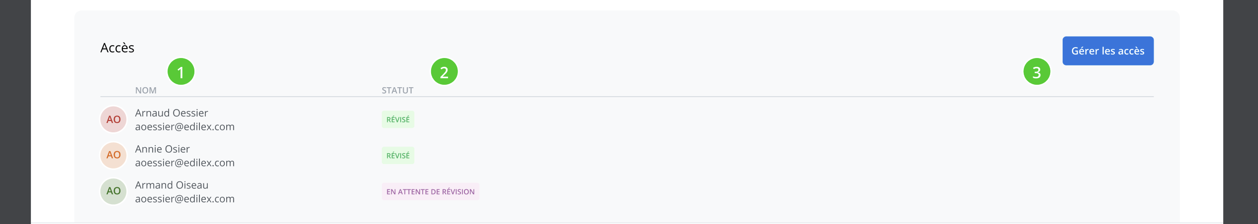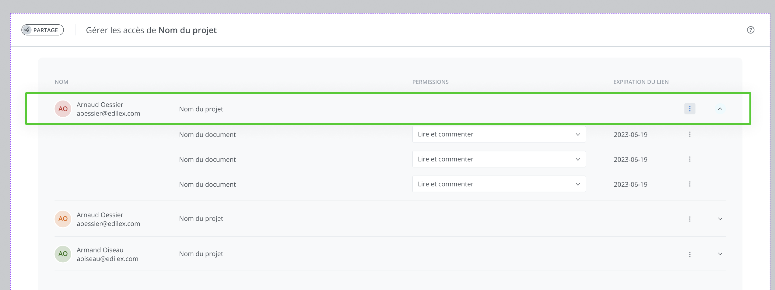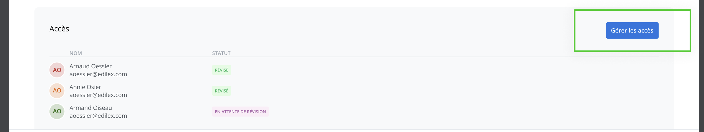Une fois le projet partagé, la section accès affiche la liste des utilisateurs qui ont accès à au moins un des documents de votre projet et permet d’accéder à la fonctionnalité de gestion des accès.