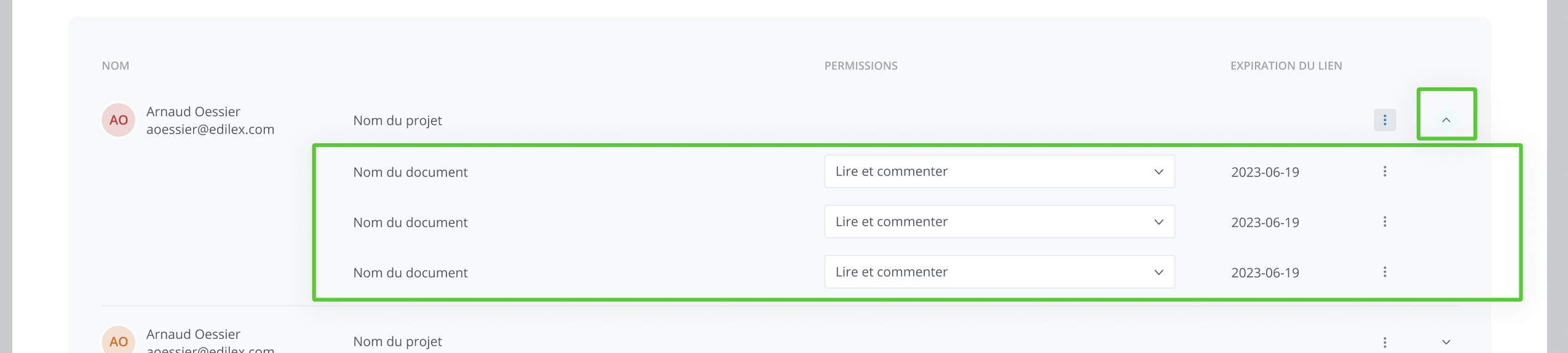 Réduire/développer la liste des documents partagés du projet: À l’aide du bouton Chevron situé à l'extrême droite de la ligne, il vous ai possible d’afficher ou cacher la liste des documents pour allégé la lecture du tableau, par exemple dans le cas que vous auriez partagé le même projet à de multiples utilisateurs, vous pouvez de cette manière facilité la consultation des informations d’accès.