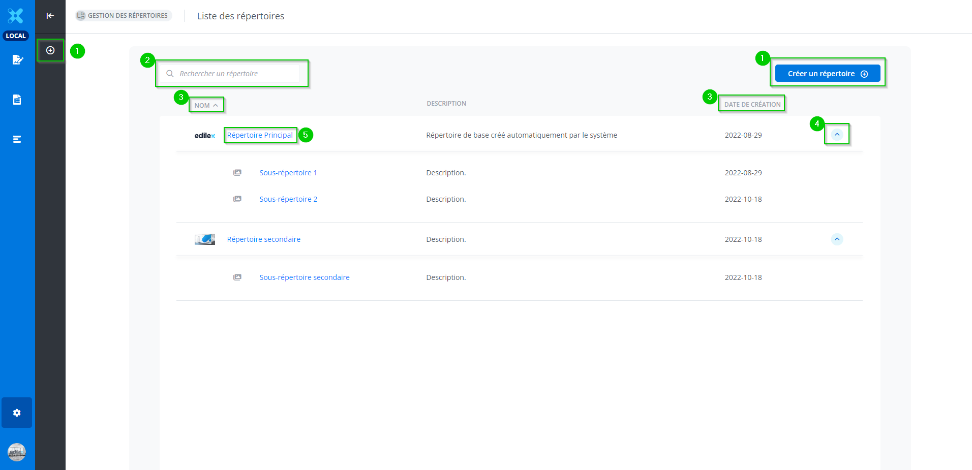 La gestion des répertoires permet de segmenter la visibilité et l’accès à plusieurs types de contenus comme les champs, les mots-clés, les gabarits d’exportation, les contenus (clauses, annexes, sections), les modèles et les documents. Cette fonctionnalité permet d’organiser les différents contenus tant à l’intérieur d’une organisation qu'à l’extérieur de celle-ci. Il est possible de segmenter les contenus à l’aide de deux types de répertoires, soit des répertoires parents ou enfants, et de contrôler l’accès avec un droit de lecture ou d'écriture.