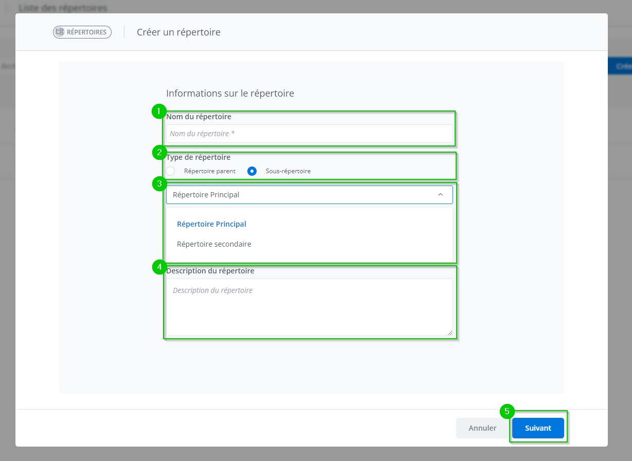 Choisir un Répertoire Parent (disponible seulement pour le type Sous-répertoire).