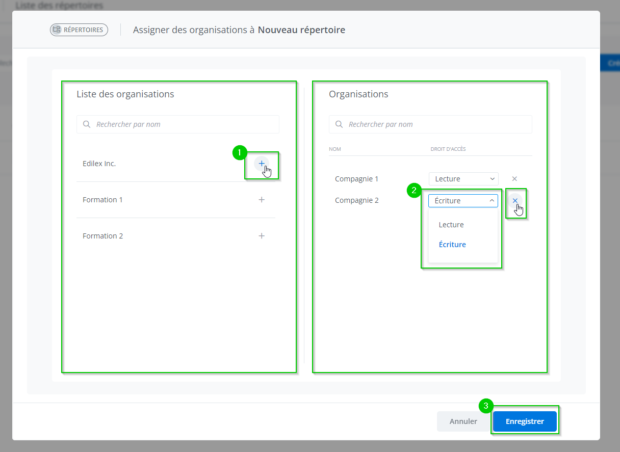Choisir un droit d’accès, Lecture ou Écriture, en cliquant sur le menu de la colonne Droit d’accès de la section Organisation. Il est possible d’utiliser la barre de recherche pour trouver facilement une organisation et de cliquer sur x pour retirer une organisation.
