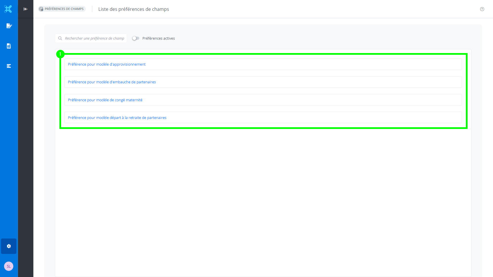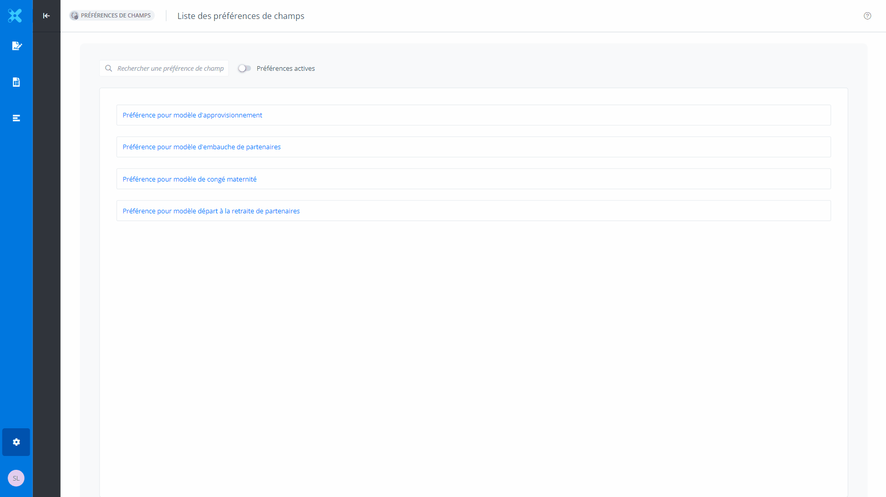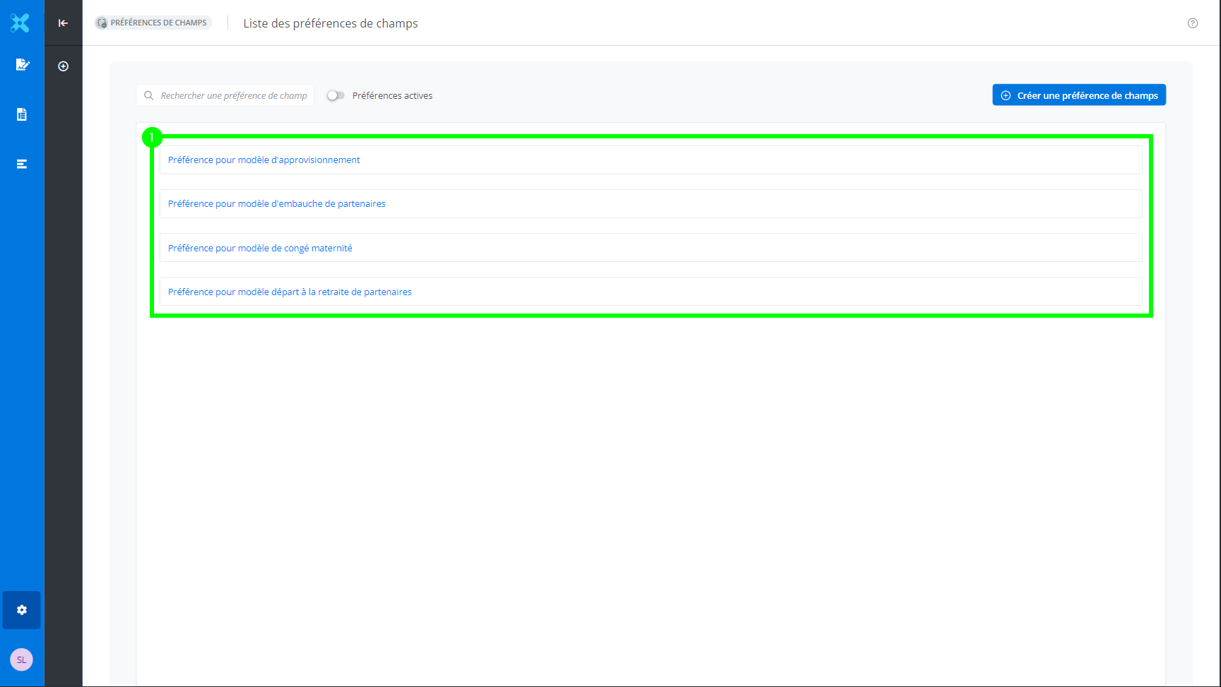 Les préférences de champs permettent de pré-sélectionner et pré-remplir des champs qui se répètent afin de les associer à un modèle par la suite; celles-ci sont définies au niveau des organisations et des utilisateurs.