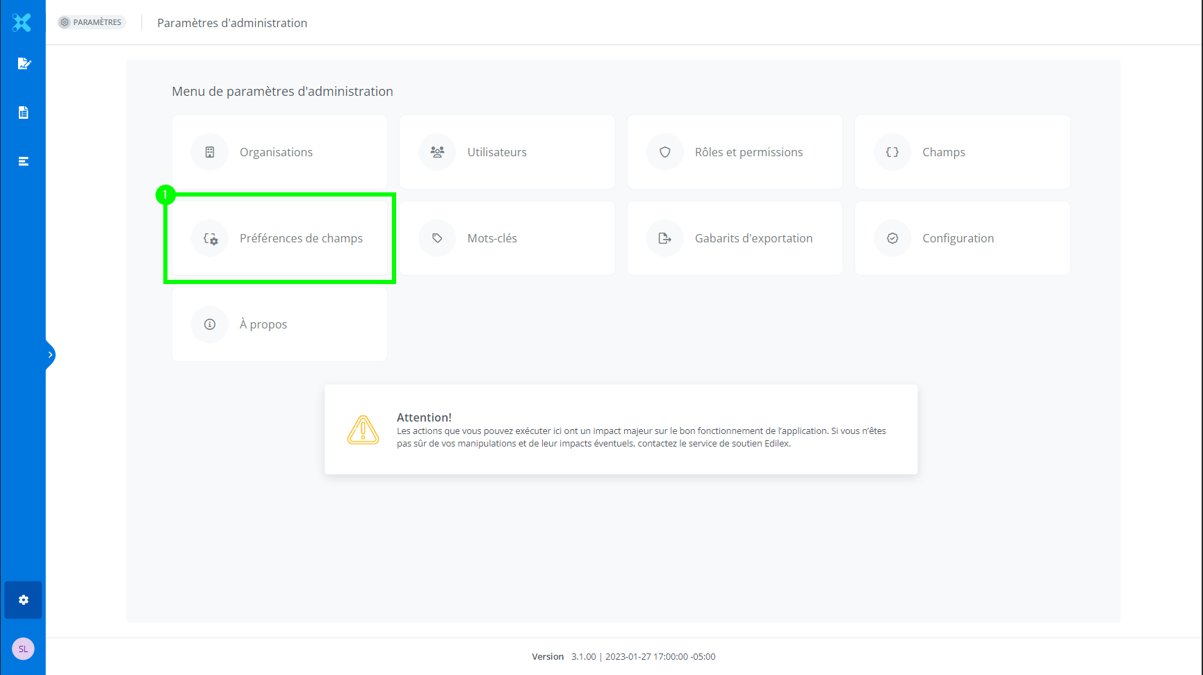 La fonctionnalité est accessible dans les paramètres d’administration de l’application. Cliquer sur l’option « préférences de champs ».