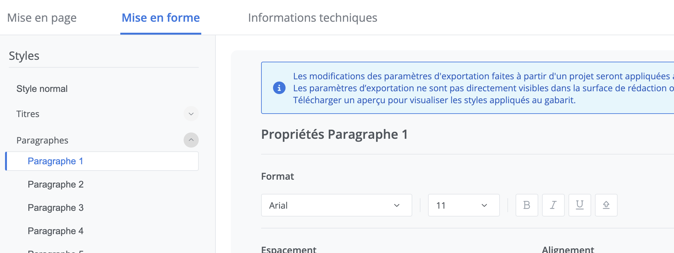 Afin d’assurer l’uniformité du document exporté et d'économiser du temps d'édition, la mise en forme globale du document doit être gérée dans le gabarit d’exportation.