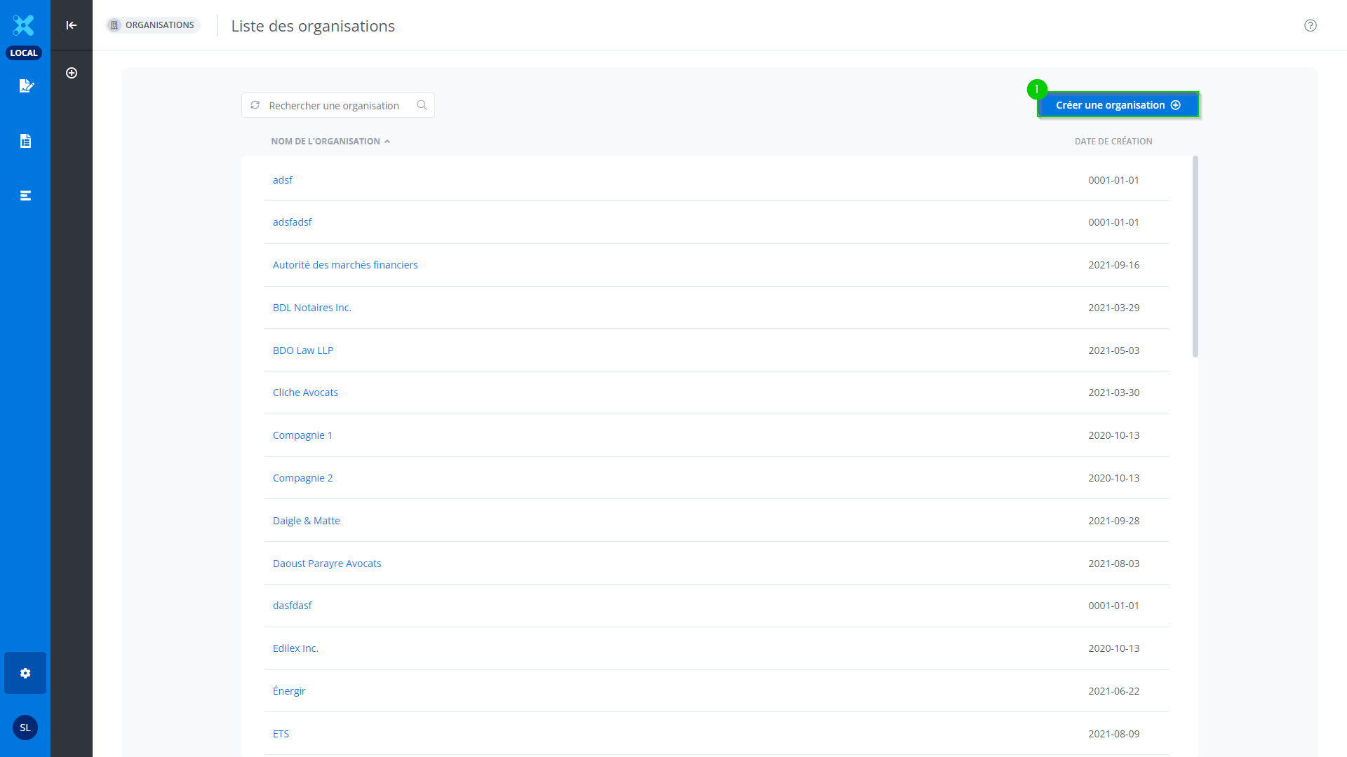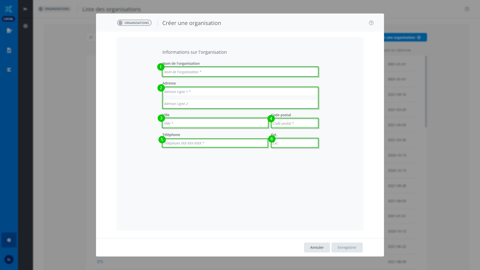 Cette fenêtre permet de créer une nouvelle organisation dans l’application. Les informations à entrer lors de la création d’une organisation sont :