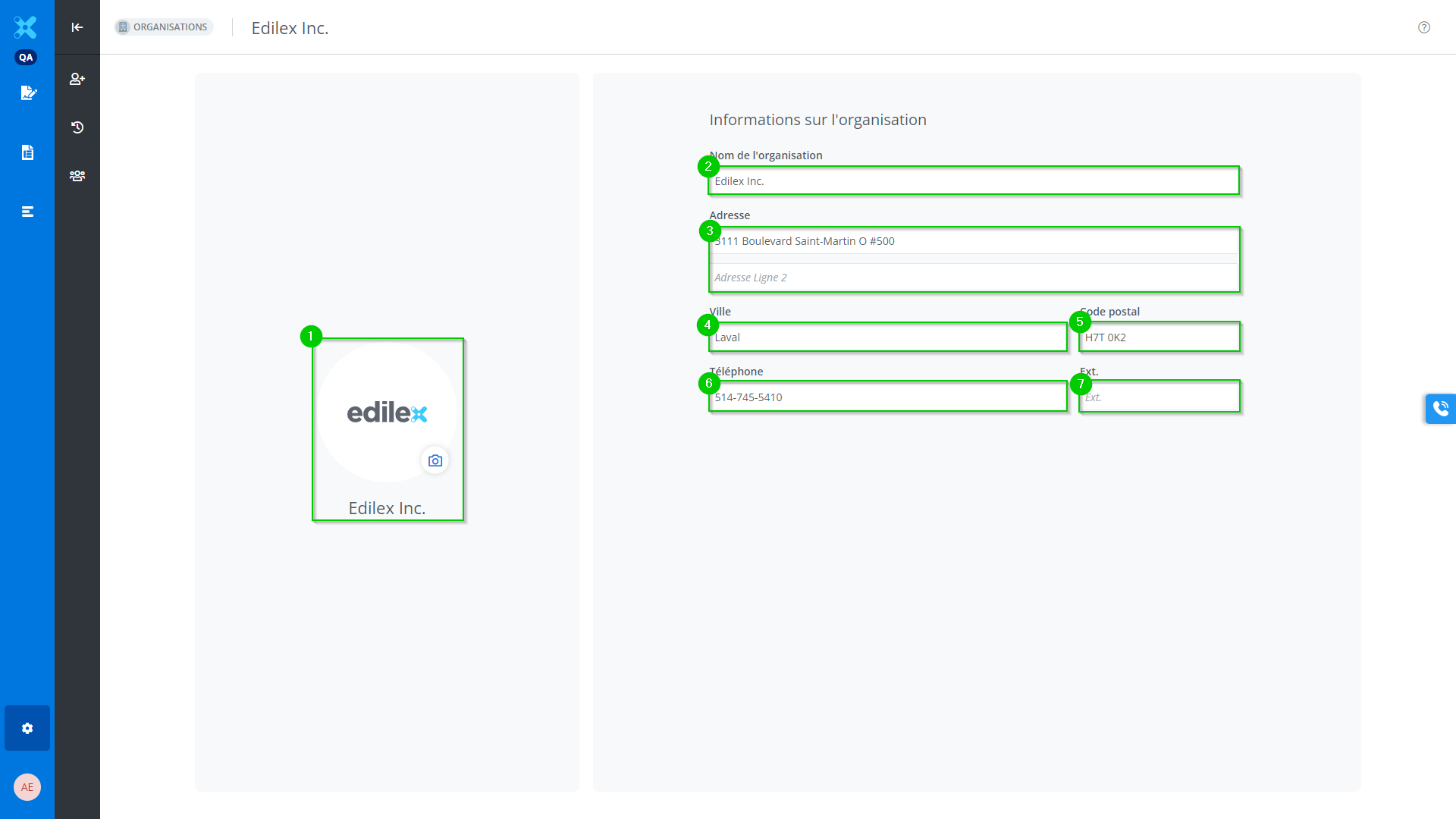 Cette fenêtre permet de modifier les différentes informations sur une organisation. Elle est composée des onglets suivants :