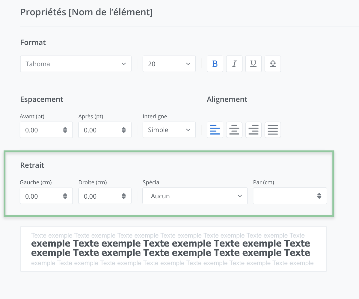 Les paramètres disponibles pour la personnalisation du retrait sont, en ordre de lecture, le retrait à partir de la gauche, le retrait à partir de la droite, le retrait spécial.