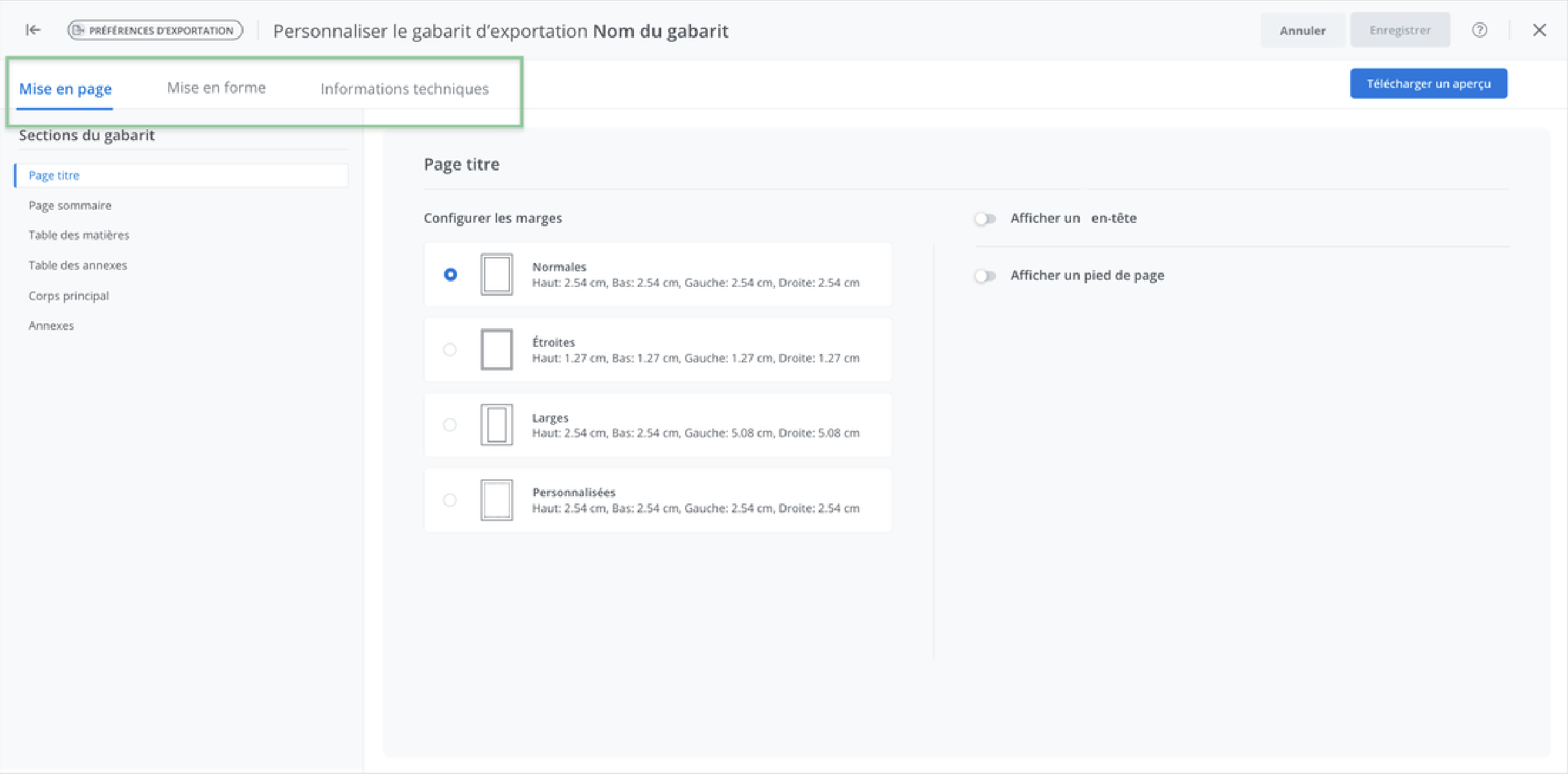Il est possible à tout moment de télécharger un aperçu de document qui reflète les options choisies dans le gabarit en cours de personnalisation.