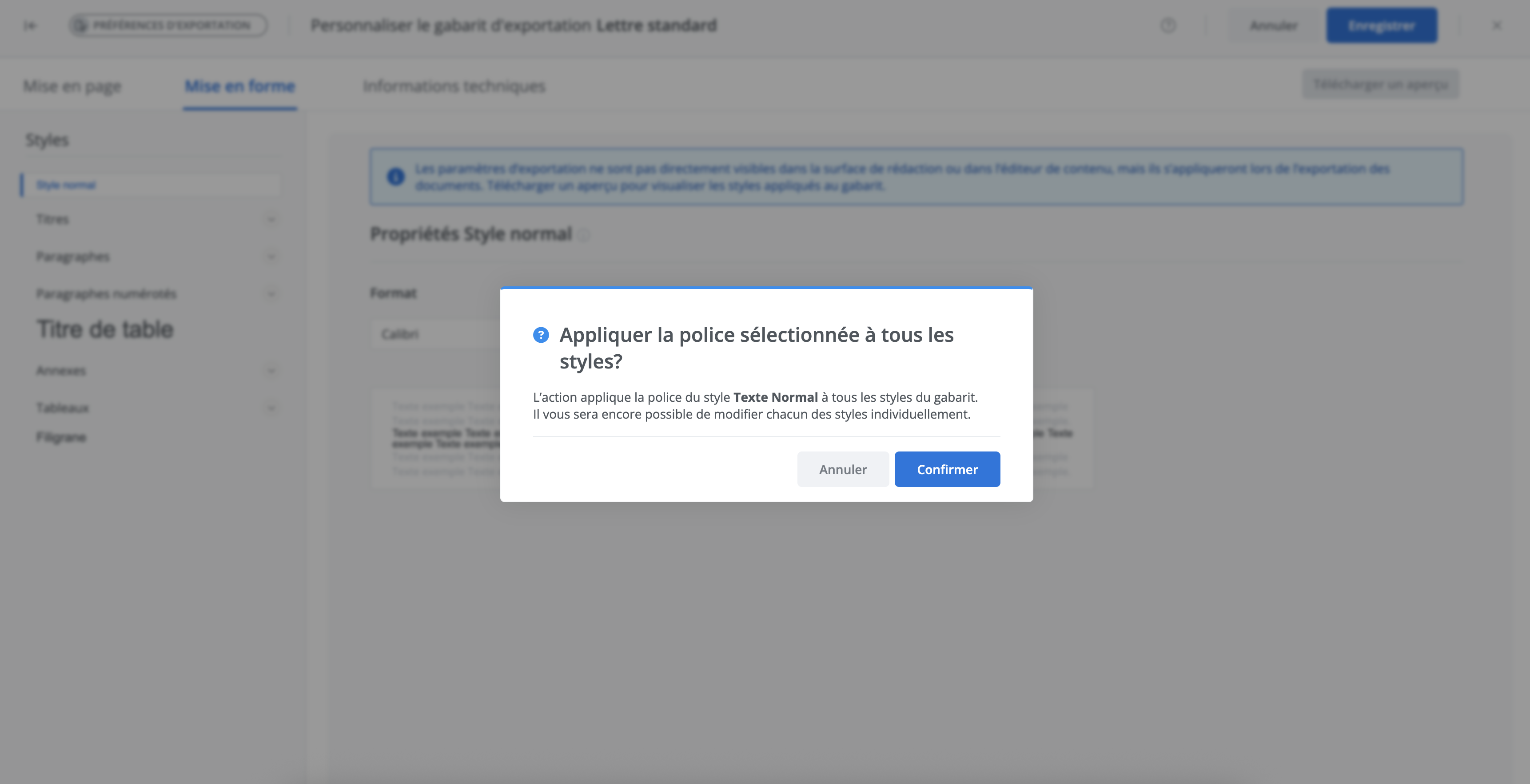 Une fenêtre de dialogue demandera une confirmation avant d’appliquer la police à tous les styles du gabarit.