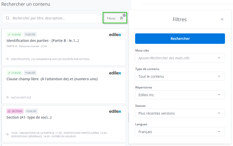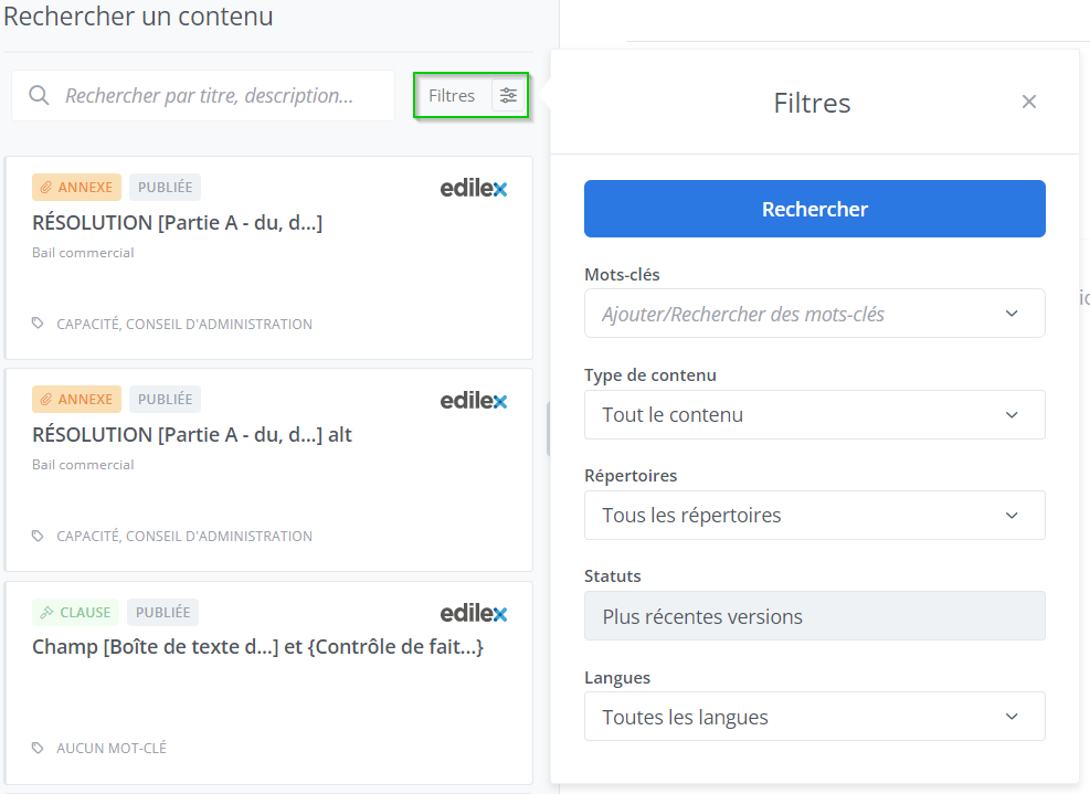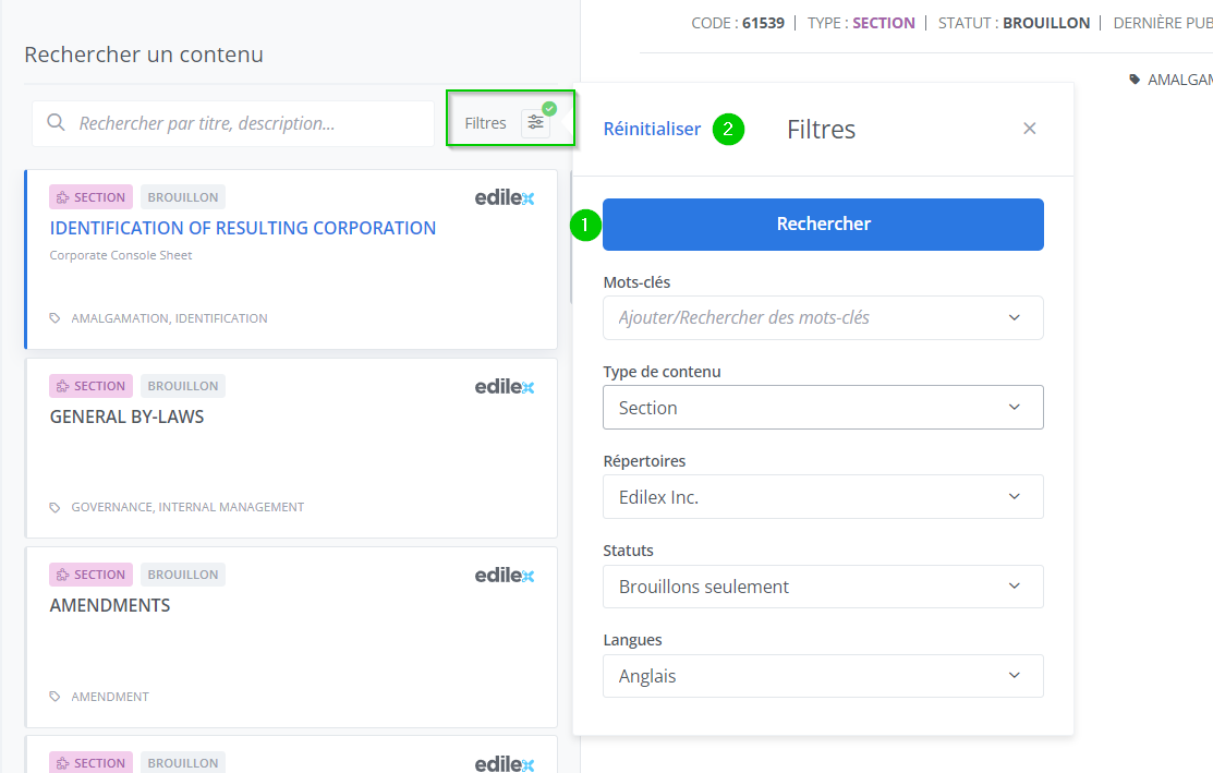 Les préférences de filtres de recherche dans le répertoire des contenus sont enregistrées au moment d’effectuer la recherche (1). Tous les filtres sont enregistrés et peuvent être réinitialisés avec le bouton Réinitialiser (2).