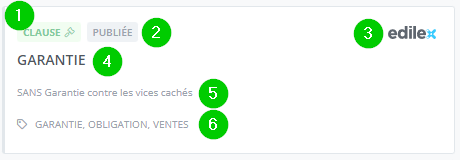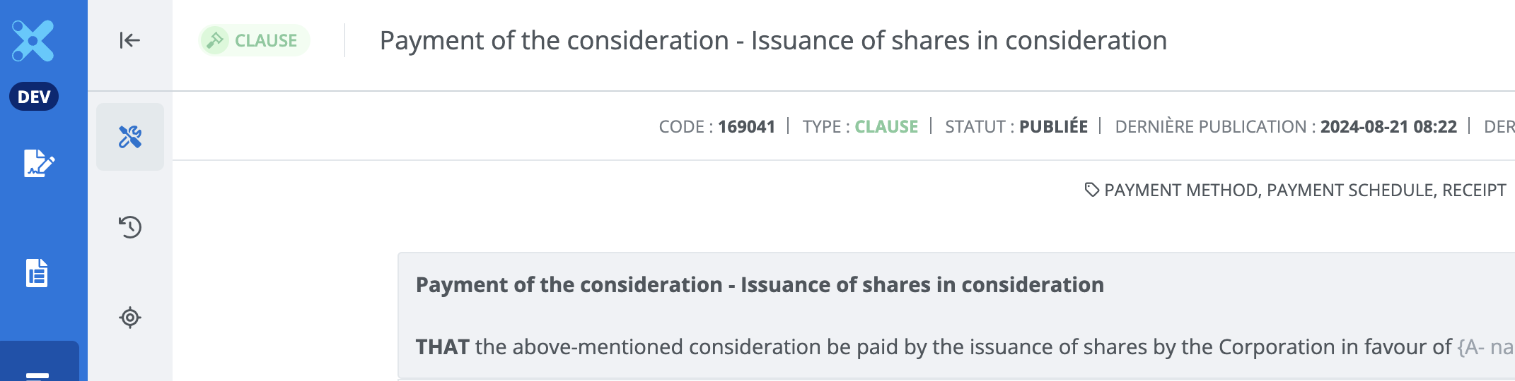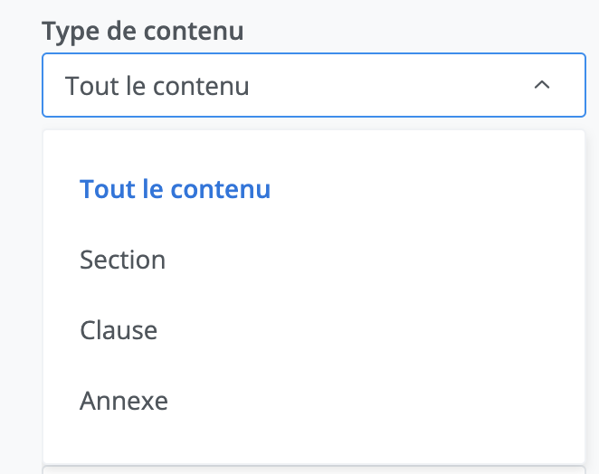 Les contenus peuvent être filtrés selon leur type, soit clause, section ou annexe. Il n’est possible de sélectionner qu’un seul type de contenu à la fois.