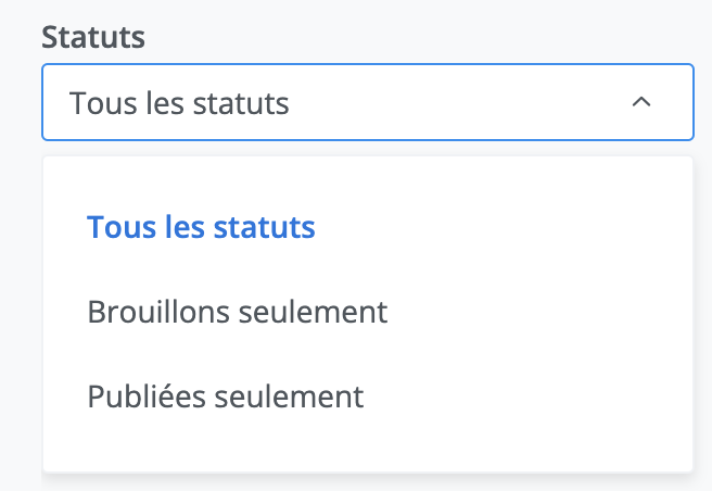 Les contenus peuvent être filtrés selon leur statut, soit brouillon ou publié.