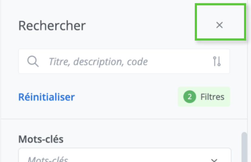 Pour retirer un mot-clé des filtres, il est possible d’appuyer sur le « X » associé à ce mot-clé sous la barre de recherche (1) ou retirer la sélection dans le panneau de filtres (2).