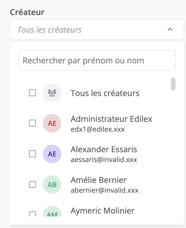 Cherchez les contenus à l’aide des informations techniques de création d’un contenu. Les utilisateurs de votre organisation ayant créé des contenus pourront être sélectionnés dans ce menu déroulant.
