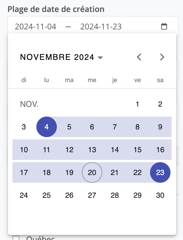 Sélectionnez une date de début et une date de fin afin d’obtenir dans vos résultats la liste des contenus ayant été créés durant cette période.