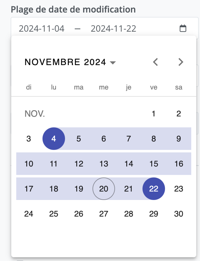 Sélectionnez une date de début et une date de fin afin d’obtenir dans vos résultats la liste des contenus ayant été modifiés durant cette période.
