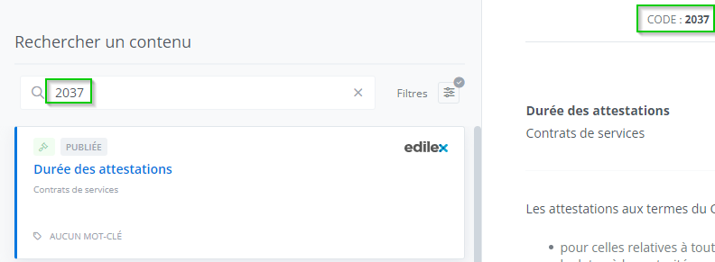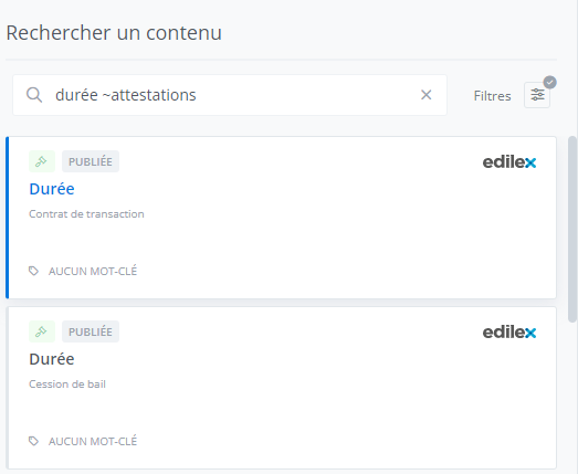 Il est possible d’exclure des contenus ayant un terme exact dans le titre ou la description avec le symbole «~». Par exemple, lors d’une recherche de «durée ~attestations» les contenus qui contiennent « société » seront affichés, mais ceux contenant aussi « attestations » seront exclus des résultats.