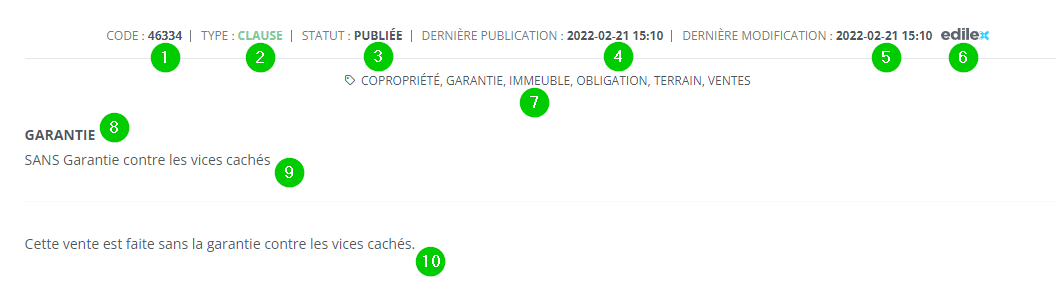 Le moteur de recherche tient compte du titre du contenu, de sa description, des mots-clés qui lui ont été assignés et, dans le cas d’une clause ou d’une annexe, du contenu lui-même.