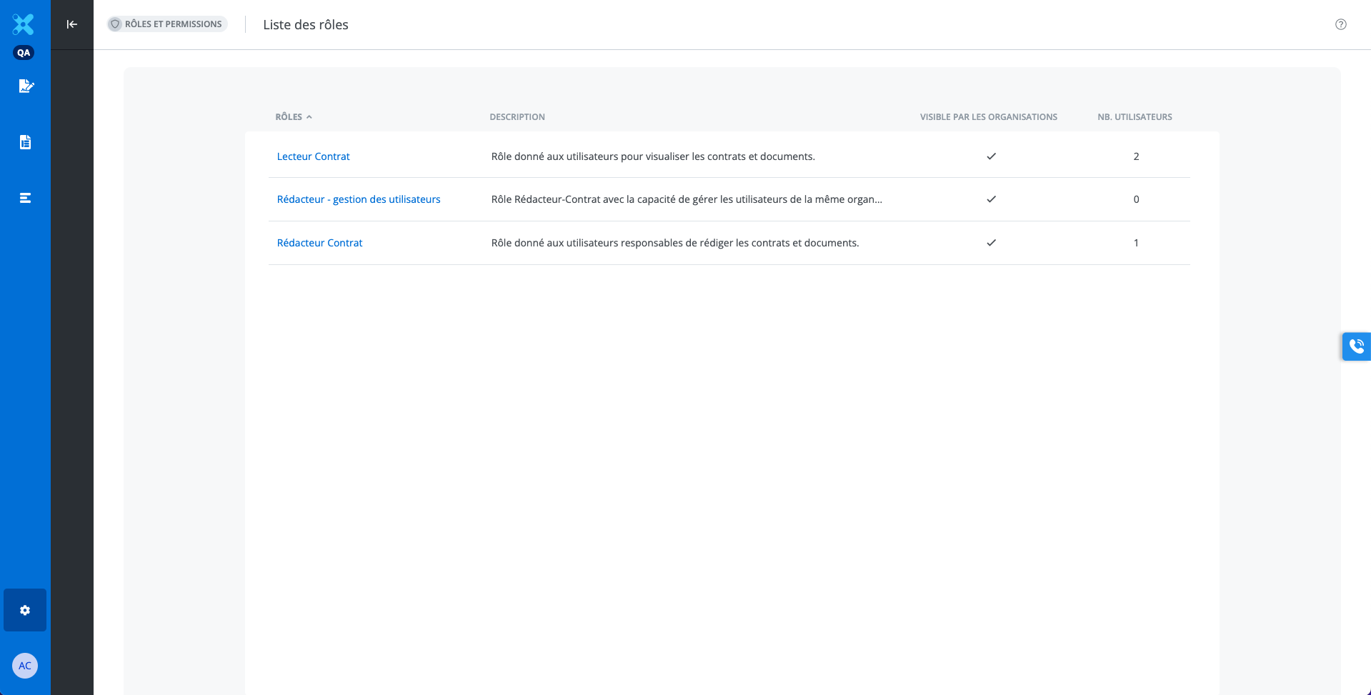 La liste des rôles affiche l’ensemble des rôles que peuvent avoir les utilisateurs de l’organisation dans la plateforme Edilexpro.