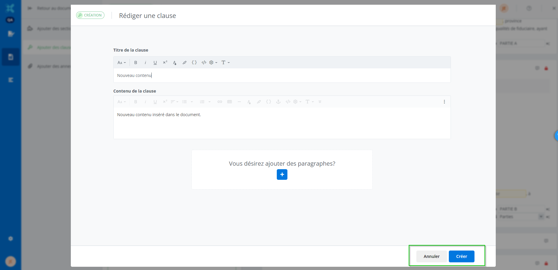 Le contenu créé est inséré dans le document en cliquant sur Créer. Cliquer sur Annuler pour qu’aucun contenu ne soit créé ou inséré dans le document.